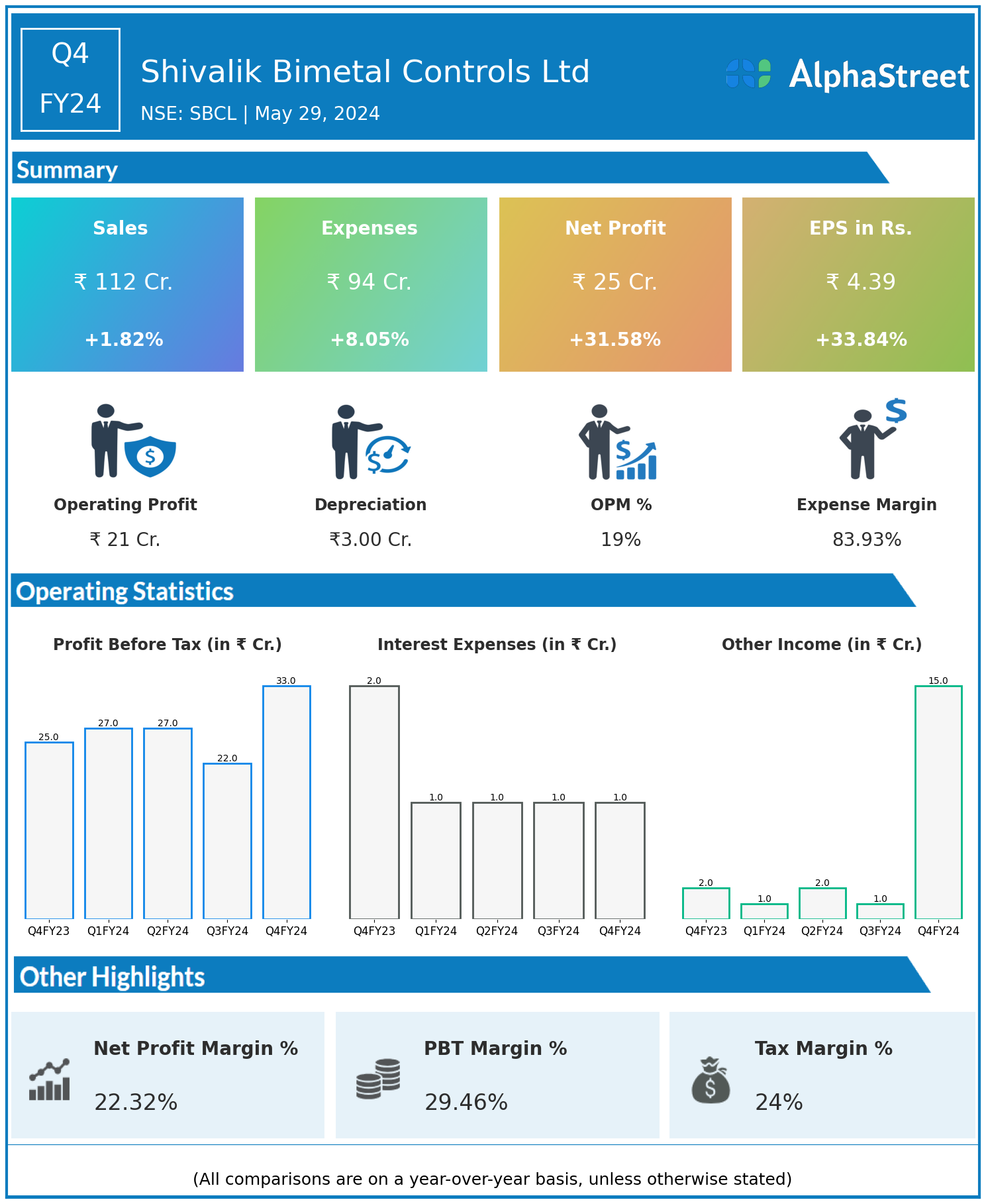 Shivalik Bimetal Controls Ltd reported Revenues for Q4FY24 of ₹112.00 Crores up from ₹110.00 Crore year on year, a rise of 1.82%.