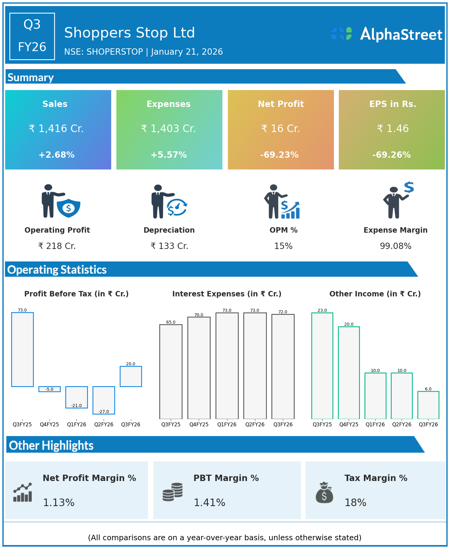 - During Q3 FY26, Shoppers Stop opened 3 department stores, 3 INTUNE stores and 1 HomeStop store, continuing its store expansion strategy despite profitability pressures.