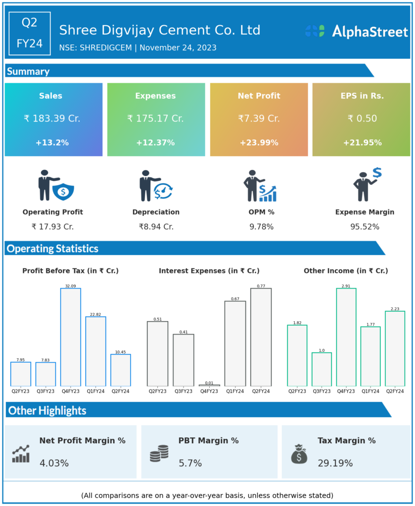 Shree Digvijay Cement Co. Ltd reported Revenues for Q2FY24 of ₹183.39 Crores up from ₹162.01 Crore year on year, a rise of 13.2%.