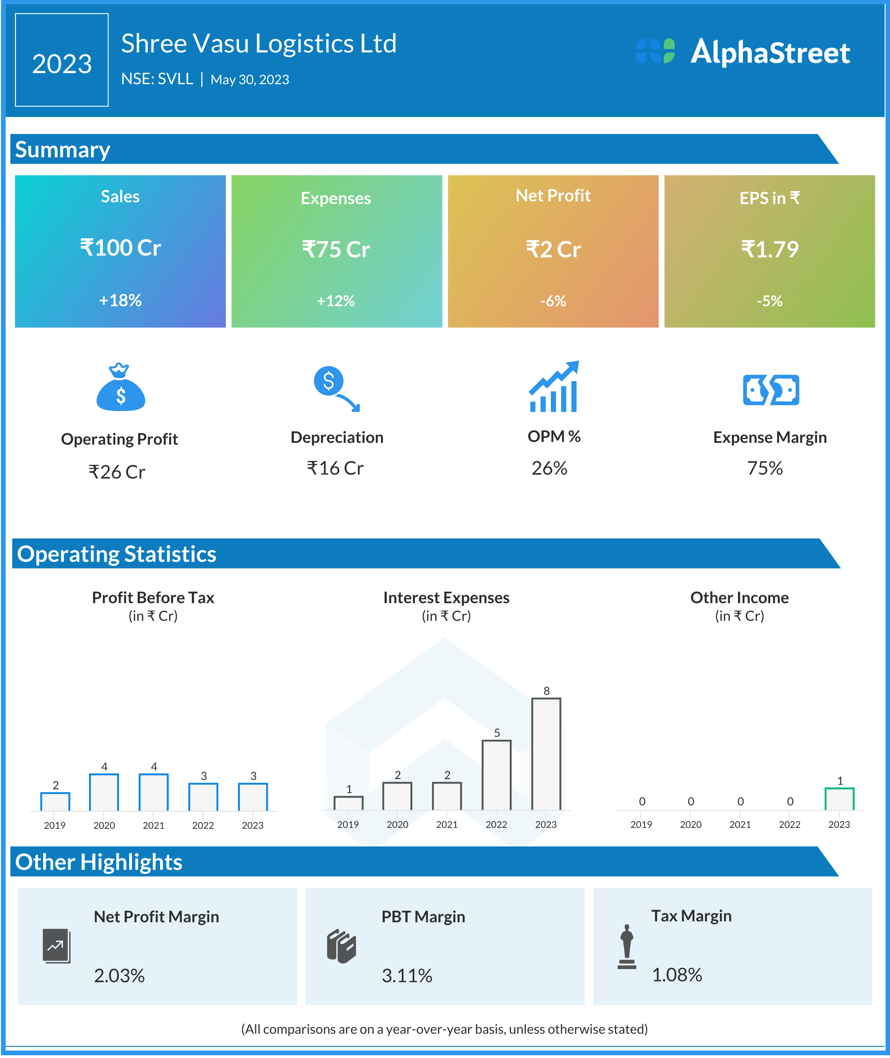 Shree Vasu Logistics Ltd reported Revenues for FY23 of ₹100 Crores up from ₹85 Crore year on year, a rise of 18%.