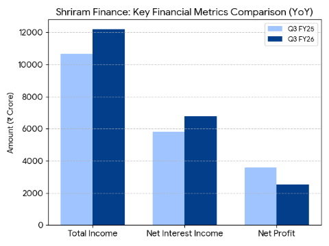 Profit Context: The 29.4% drop in Net Profit is primarily due to a one-time gain of ₹1,489.39 crore recorded in Q3 FY25 from the sale of its stake in Shriram Housing Finance. Excluding this exceptional item, the normalized profit grew by approximately 21% YoY.
