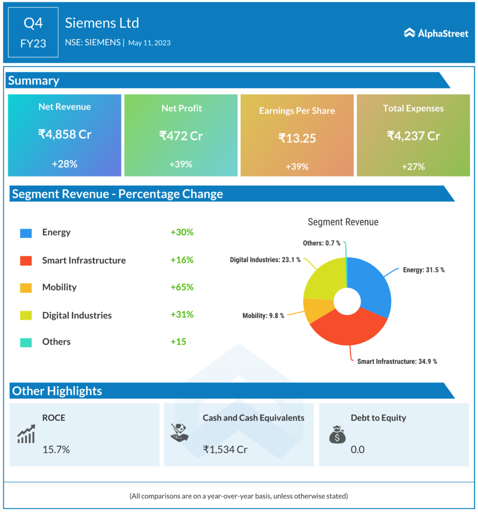 Siemens Limited reported Total revenue for Q4 FY23 of ₹4,858 Crore, up from ₹3,801 Crore year on year depicting a growth of 28%. Consolidated Net Profit of ₹472 Crore, up 39% from ₹340 Crore in the same quarter of the previous year. The Earnings per Share is ₹13.25, up 39% from ₹9.55 in the same quarter of the previous year.