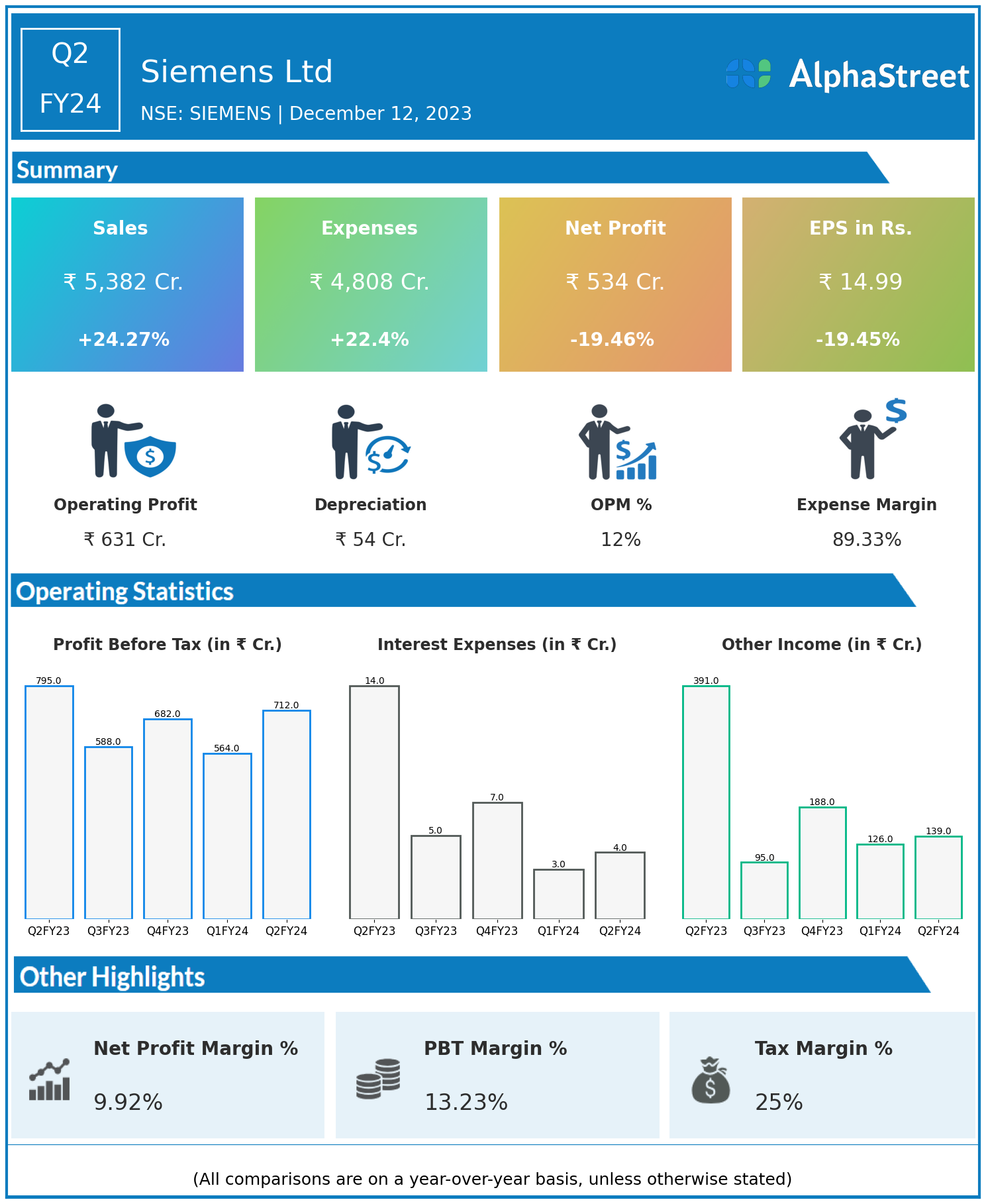 Siemens Ltd reported Revenues for Q2FY24 of ₹5,382.00 Crores up from ₹4,331.00 Crore year on year, a rise of 24.27%.