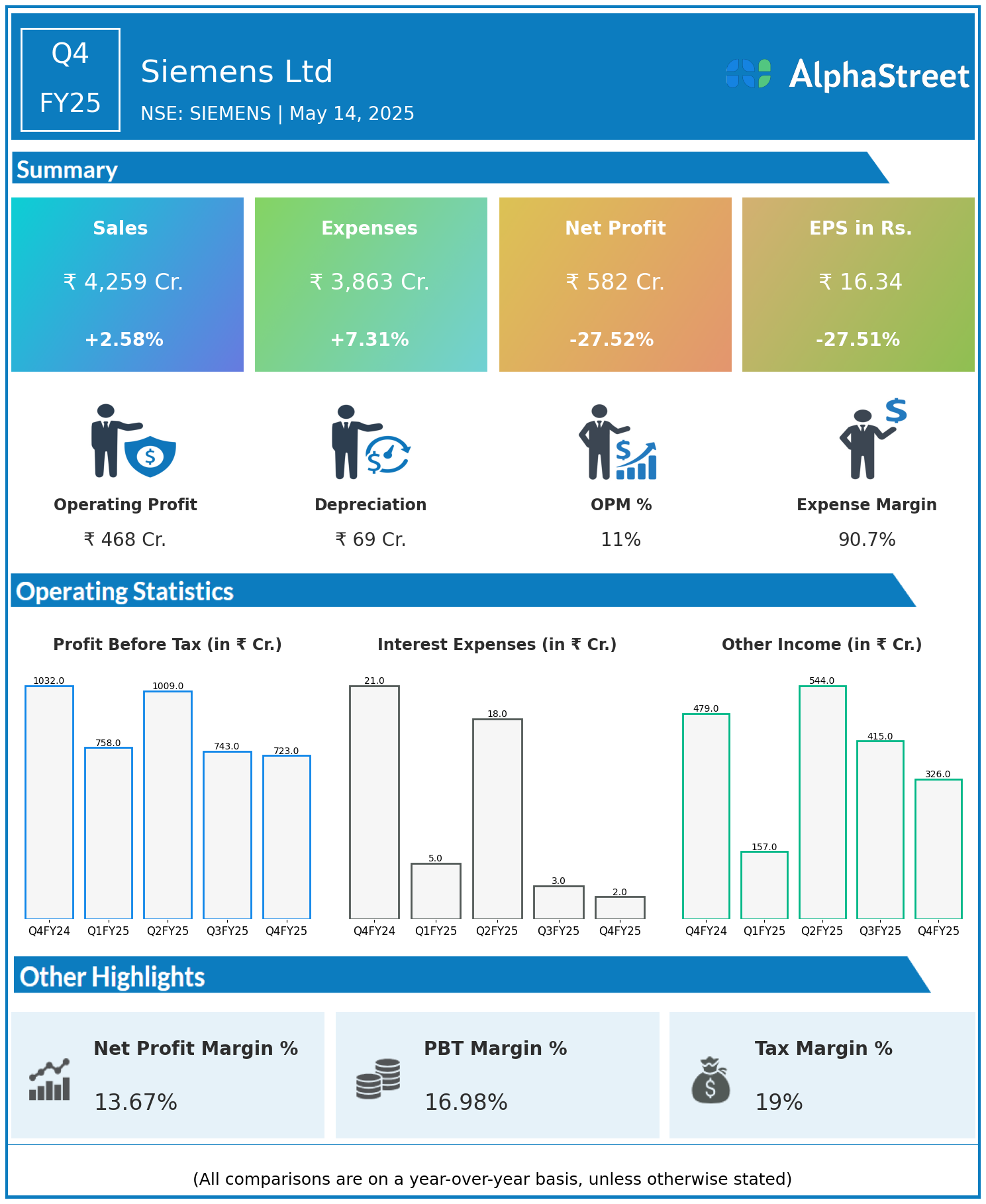 Siemens Ltd reported Revenues for Q4FY25 of ₹4,259.00 Crores up from ₹4,152.00 Crore year on year, a rise of 2.58%.