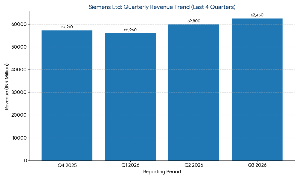 For the third quarter ended June 30, 2026, Siemens Ltd reported consolidated revenue from operations of INR 62,450 million, a 12.4% increase compared to INR 55,560 million in the same period last year. Net profit for the quarter rose to INR 6,320 million, up 15.1% from INR 5,490 million year-over-year.