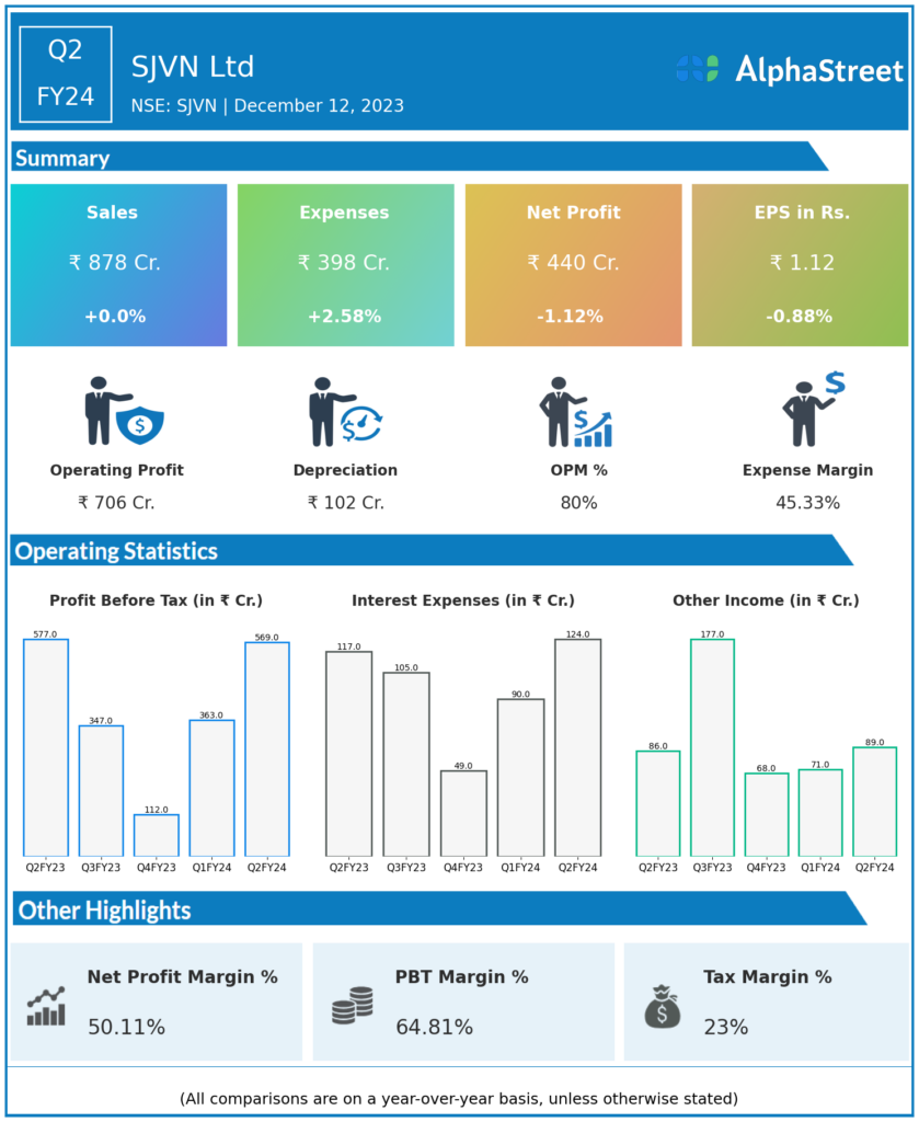 SJVN Ltd reported Revenues for Q2FY24 of ₹878.00 Crores same from ₹878.00 Crore year on year.