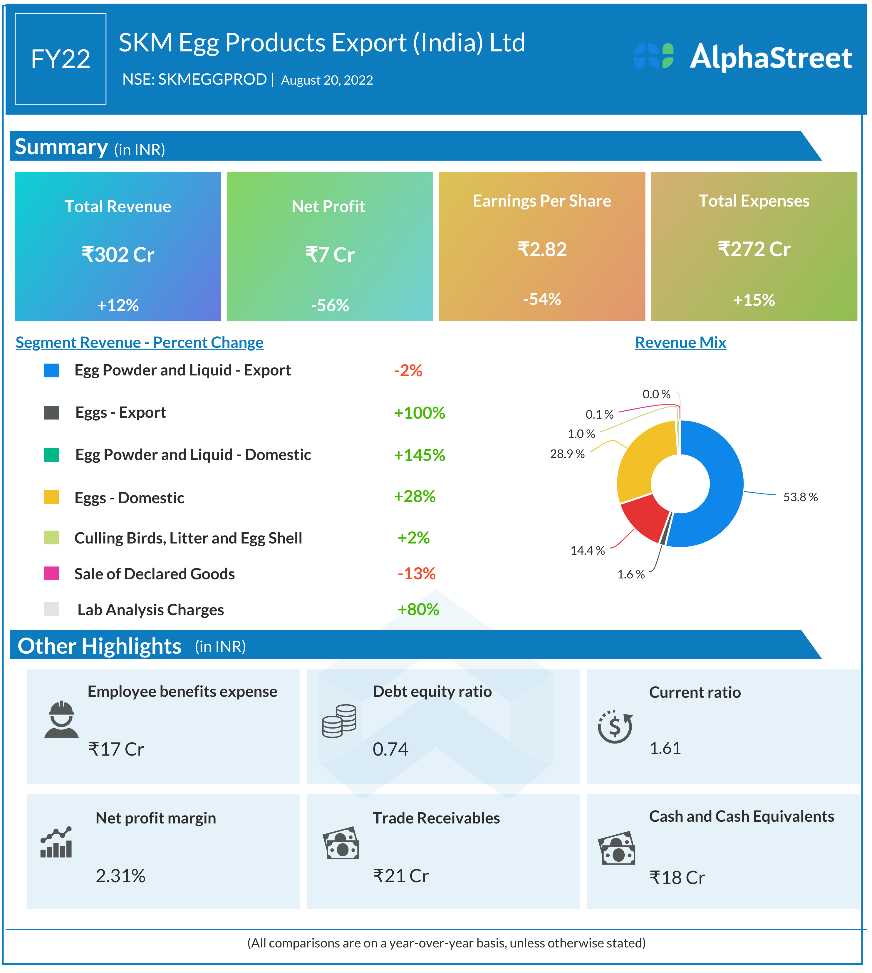 SKM Egg Products Export (India) Ltd reported Revenues for FY22 of ₹302 Crores up from ₹269 Crore year on year, a rise of 12%.