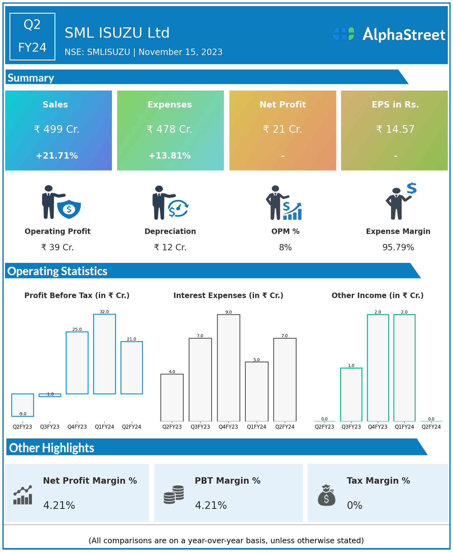 SML ISUZU Ltd reported Revenues for Q2FY24 of ₹499.00 Crores up from ₹410.00 Crore year on year, a rise of 21.71%.