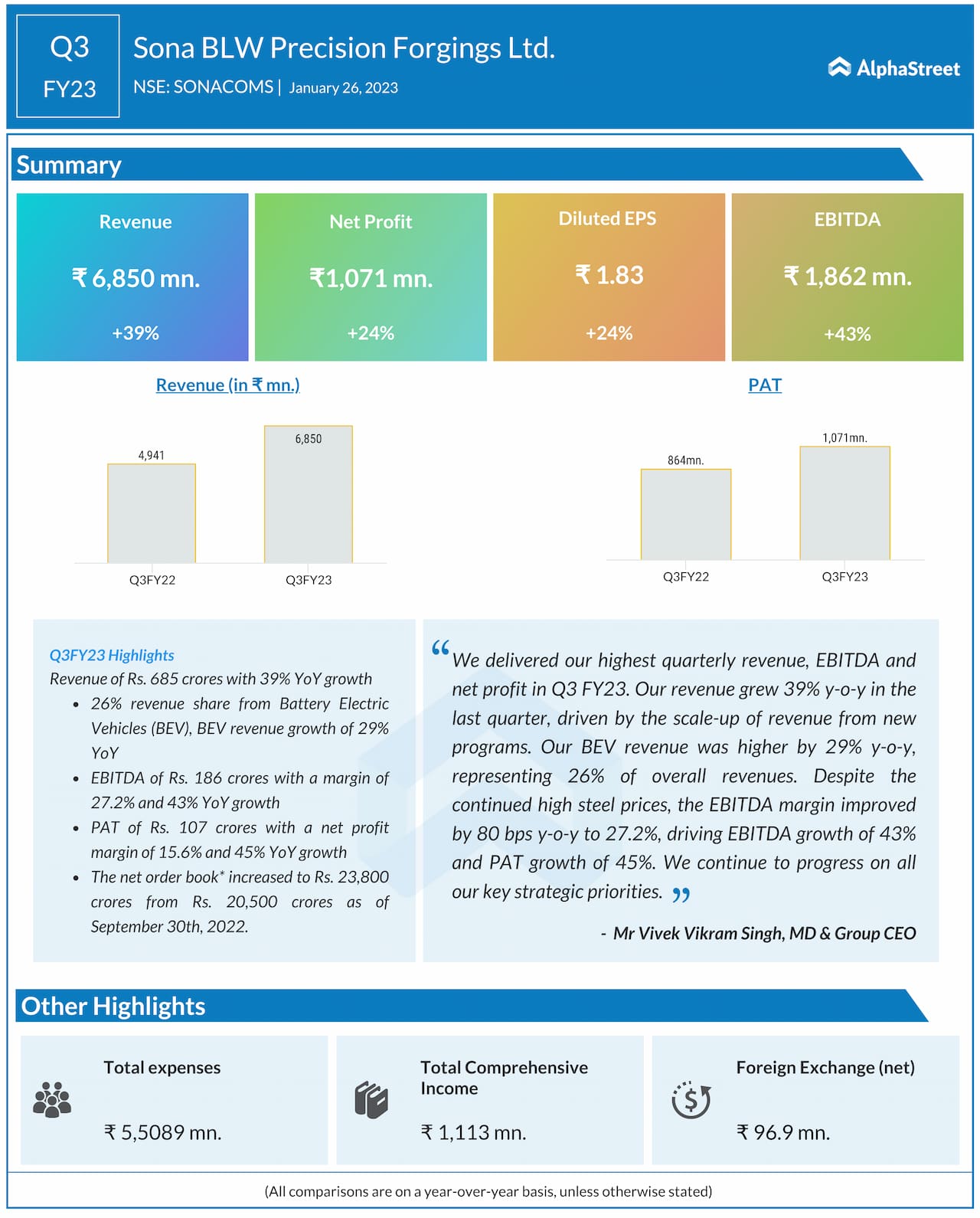 Sona Blw Precision Forgings Ltd.’s revenue in Q3FY23 rose 39% to ₹ 6,850 millions. Consolidated Profit After Tax came at ₹ 1,071 millions showcasing a 24% rise YoY over the corresponding period. In this quarter’s results, the reports suggested that the firm has continued to deliver consistent performance in all key operational and financial indicators in Q3Y23.