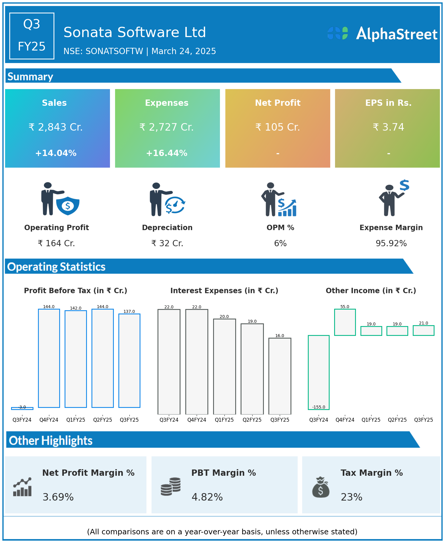 Sonata Software Ltd reported Revenues for Q3FY25 of ₹2,843.00 Crores up from ₹2,493.00 Crore year on year, a rise of 14.04%.