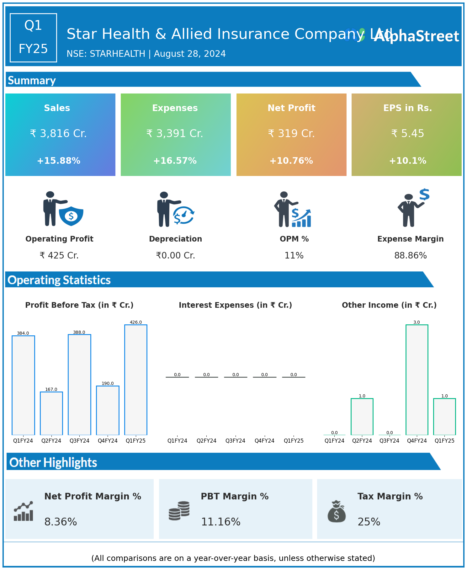 Star Health & Allied Insurance Company Ltd reported Revenues for Q1FY25 of ₹3,816.00 Crores up from ₹3,293.00 Crore year on year, a rise of 15.88%.
