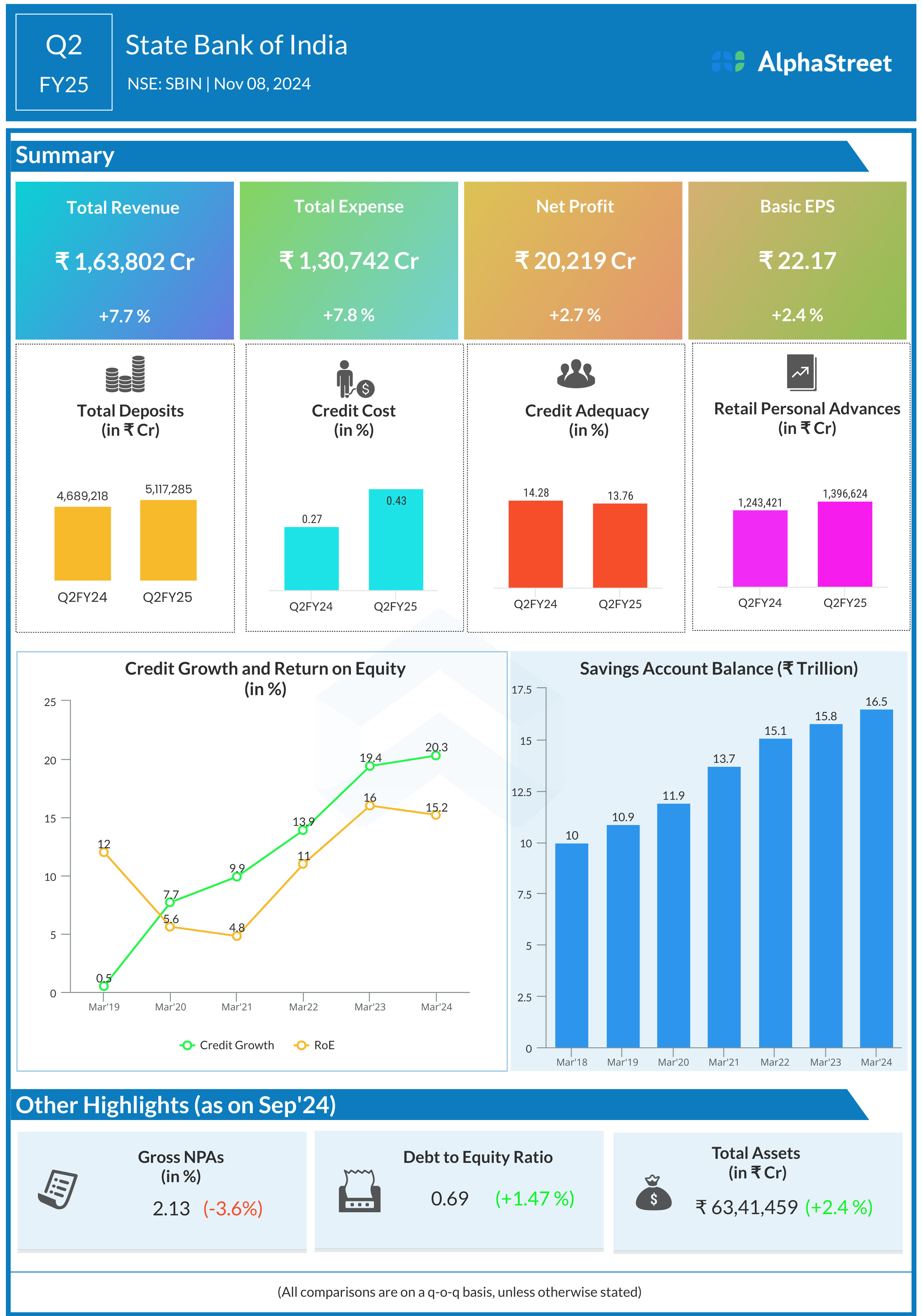 State Bank of India reported Total revenue for Q2FY25 of ₹1,63,802 Crore up from ₹1,52,125 Crore q-o-q, a rise of 7.7%.