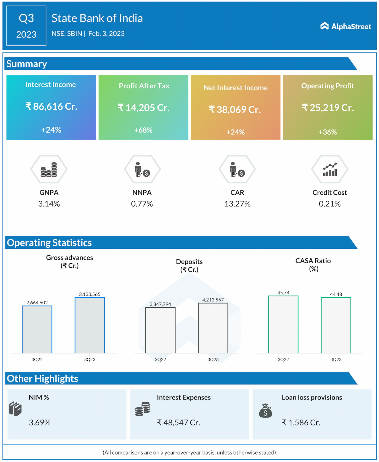 State Bank of India’s interest income in Q3FY23 rose 24% to ₹ 86,616 crores. Consolidated Profit After Tax came at ₹ 14,205 crores showcasing a 68% rise YoY over the corresponding period. In this quarter’s results, the reports suggested that the firm has continued to deliver consistent performance in all key operational and financial indicators in Q3Y23.
