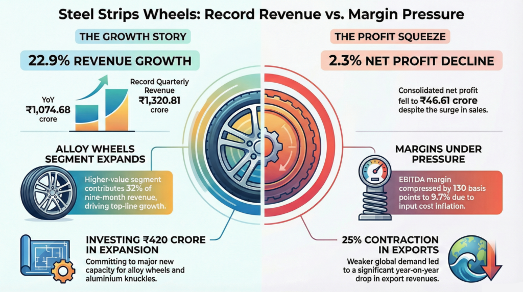 Steel Strips Wheels Ltd. (SSWL) reported record quarterly revenue of ₹1,320.81 crore for Q3 FY26, a 22.9% year-on-year increase from ₹1,074.68 crore. Consolidated net profit for the period was ₹46.61 crore, representing a 2.31% decline from ₹47.71 crore in Q3 FY25. Earnings before interest, tax, depreciation, and amortization (EBITDA) rose 8.5% to ₹127.8 crore, though the EBITDA margin compressed 130 basis points to 9.7%. The profit-after-tax margin fell to 3.5% from 4.4% in the prior-year quarter. Profit before tax stood at ₹61.65 crore, a 4.19% decrease. Sequentially, revenue grew 10% and net profit increased 31.2% compared to Q2 FY26.