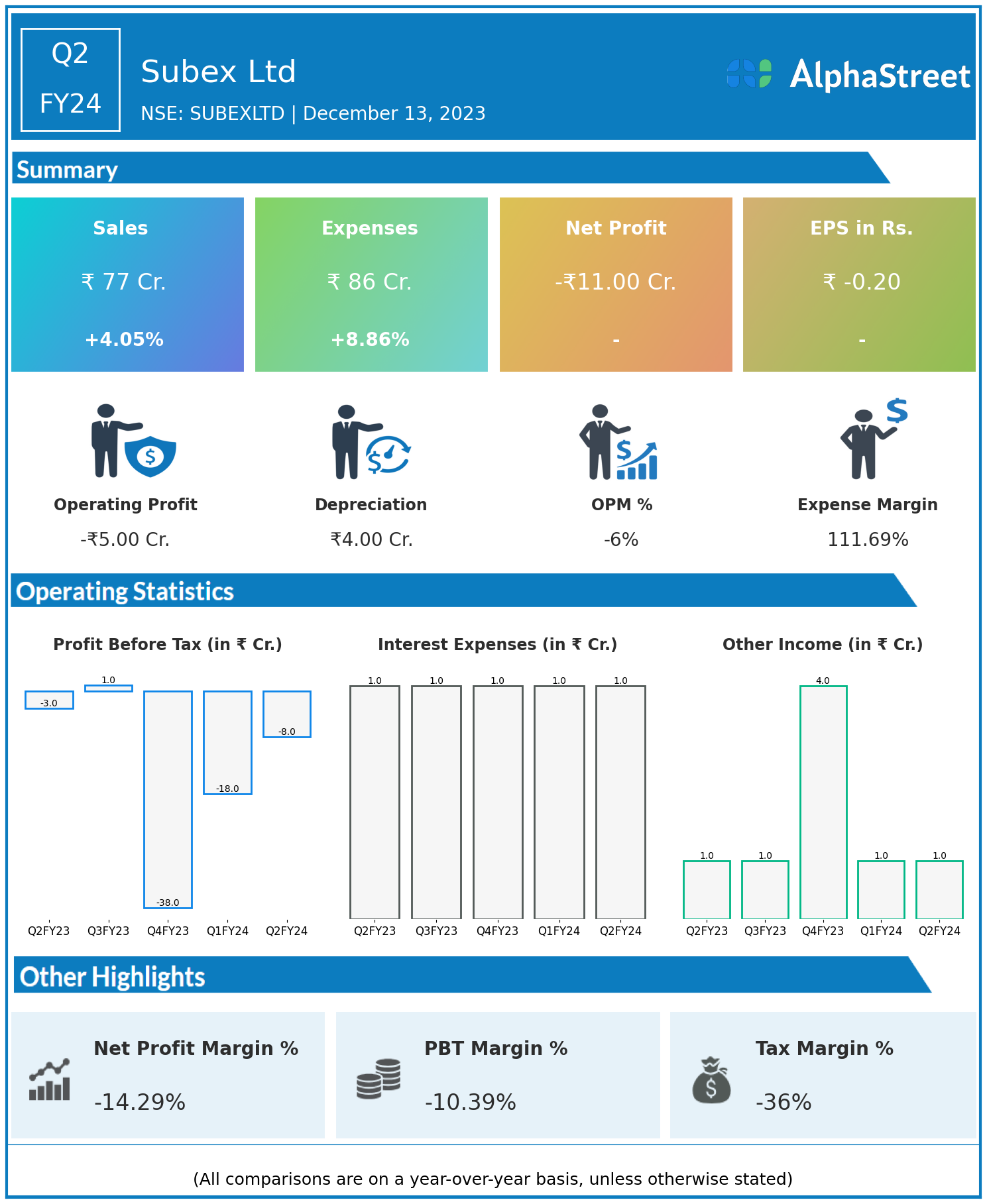 Subex Ltd reported Revenues for Q2FY24 of ₹77.00 Crores up from ₹74.00 Crore year on year, a rise of 4.05%.