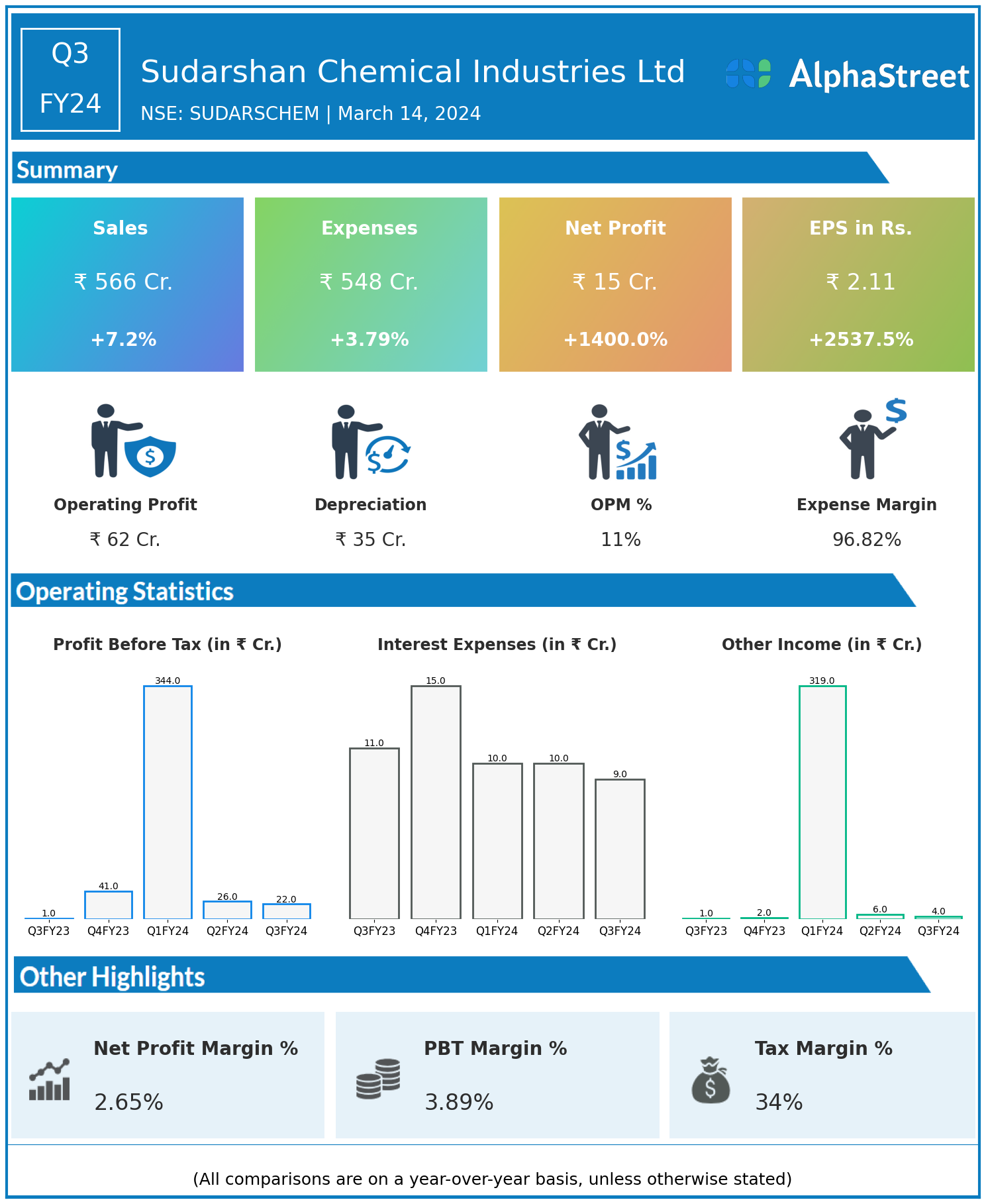 Sudarshan Chemical Industries Ltd reported Revenues for Q3FY24 of ₹566.00 Crores up from ₹528.00 Crore year on year, a rise of 7.2%.
