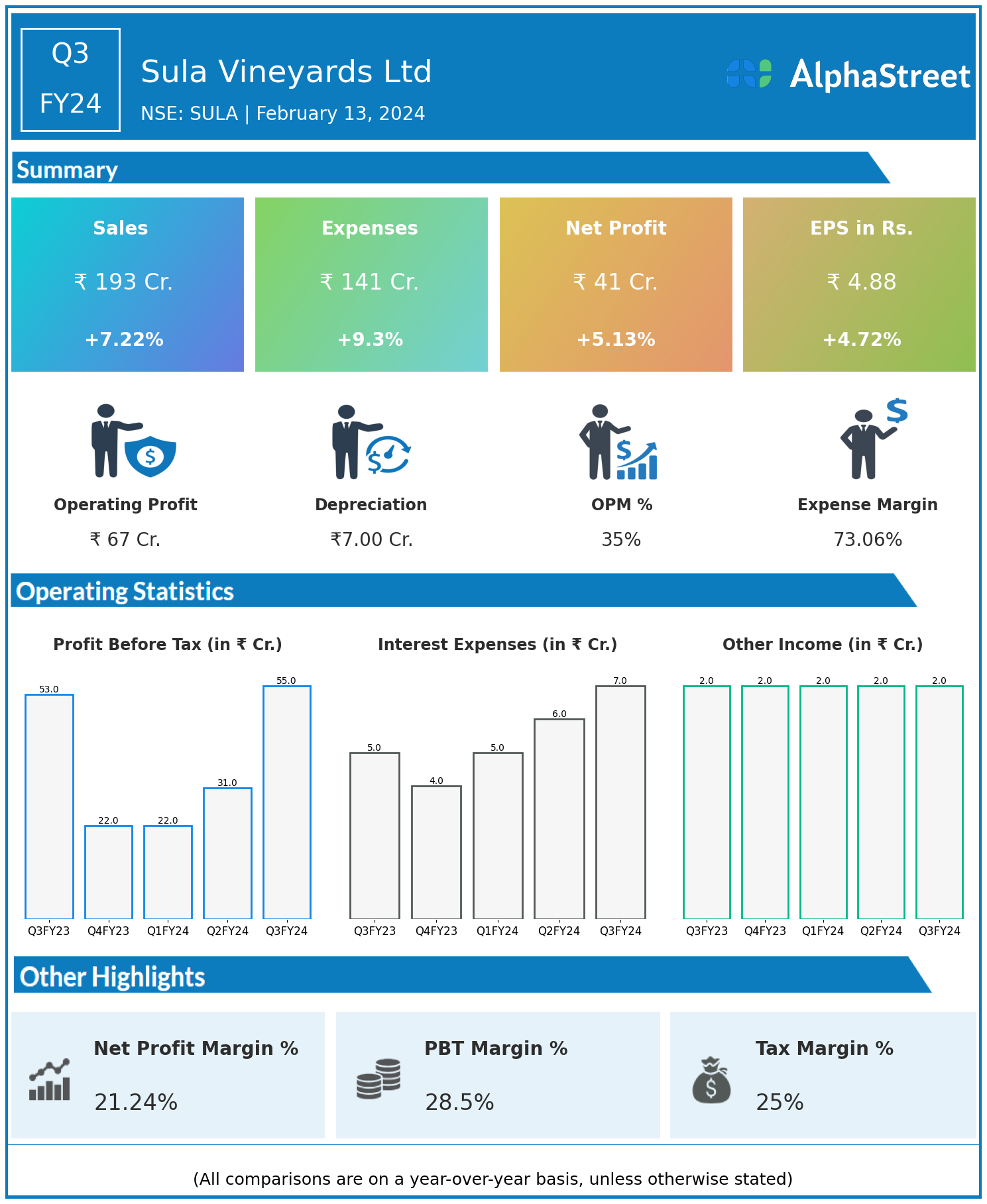 Sula Vineyards Ltd reported Revenues for Q3FY24 of ₹193.00 Crores up from ₹180.00 Crore year on year, a rise of 7.22%.