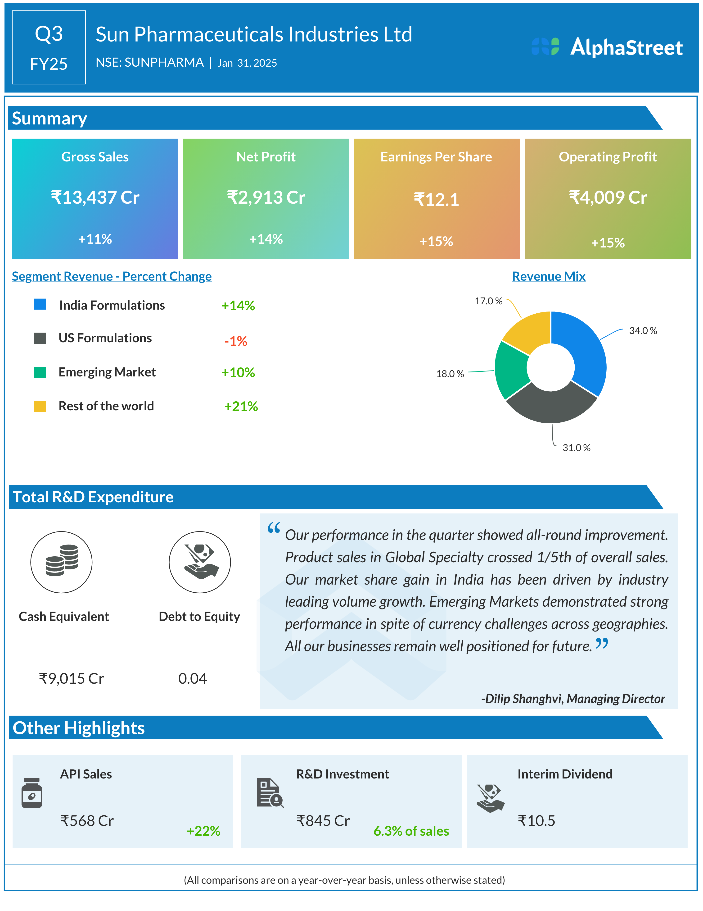Sun Pharmaceuticals Industries Ltd reported Revenues for Q3FY25 of ₹13,675.00 Crores up from ₹12,381.00 Crore year on year, a rise of 10.45%.