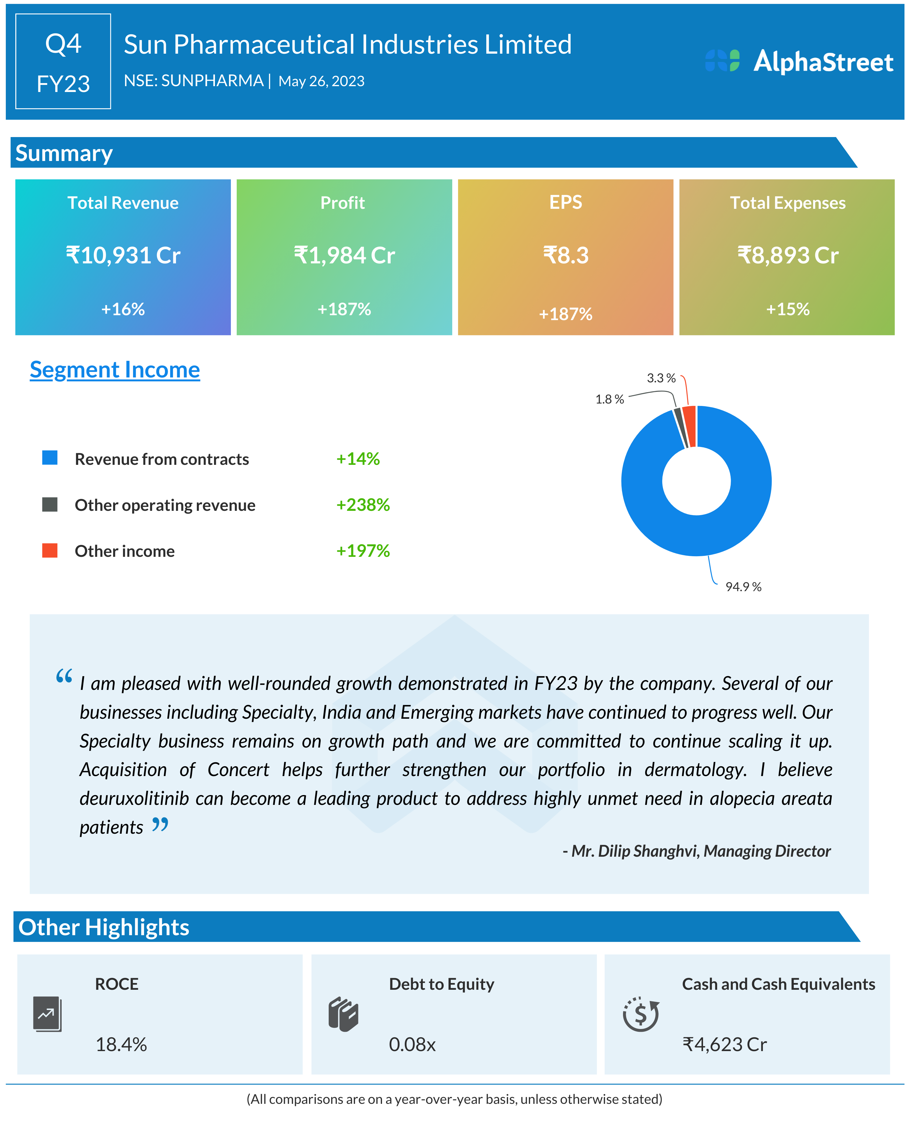Sun Pharmaceuticals Ltd reported Total revenue for Q4 FY23 of ₹10,931 Crore, up from ₹9,447 Crore year on year depicting a growth of 16%. Consolidated Net Profit of ₹1,984 Crore, up 187% from -(₹2,227) Crore in the same quarter of the previous year. The Earnings per Share is ₹8.3, up 187% from -(₹9.49) in the same quarter of the previous year.