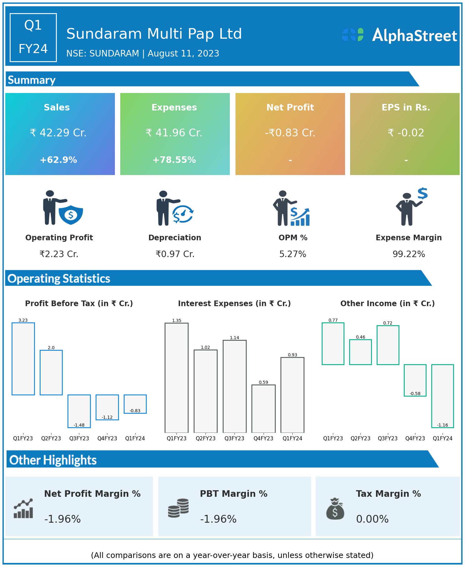 Sundaram Multi Pap Ltd reported Revenues for Q1FY24 of ₹42.29 Crores up from ₹25.96 Crore year on year, a rise of 62.9%.