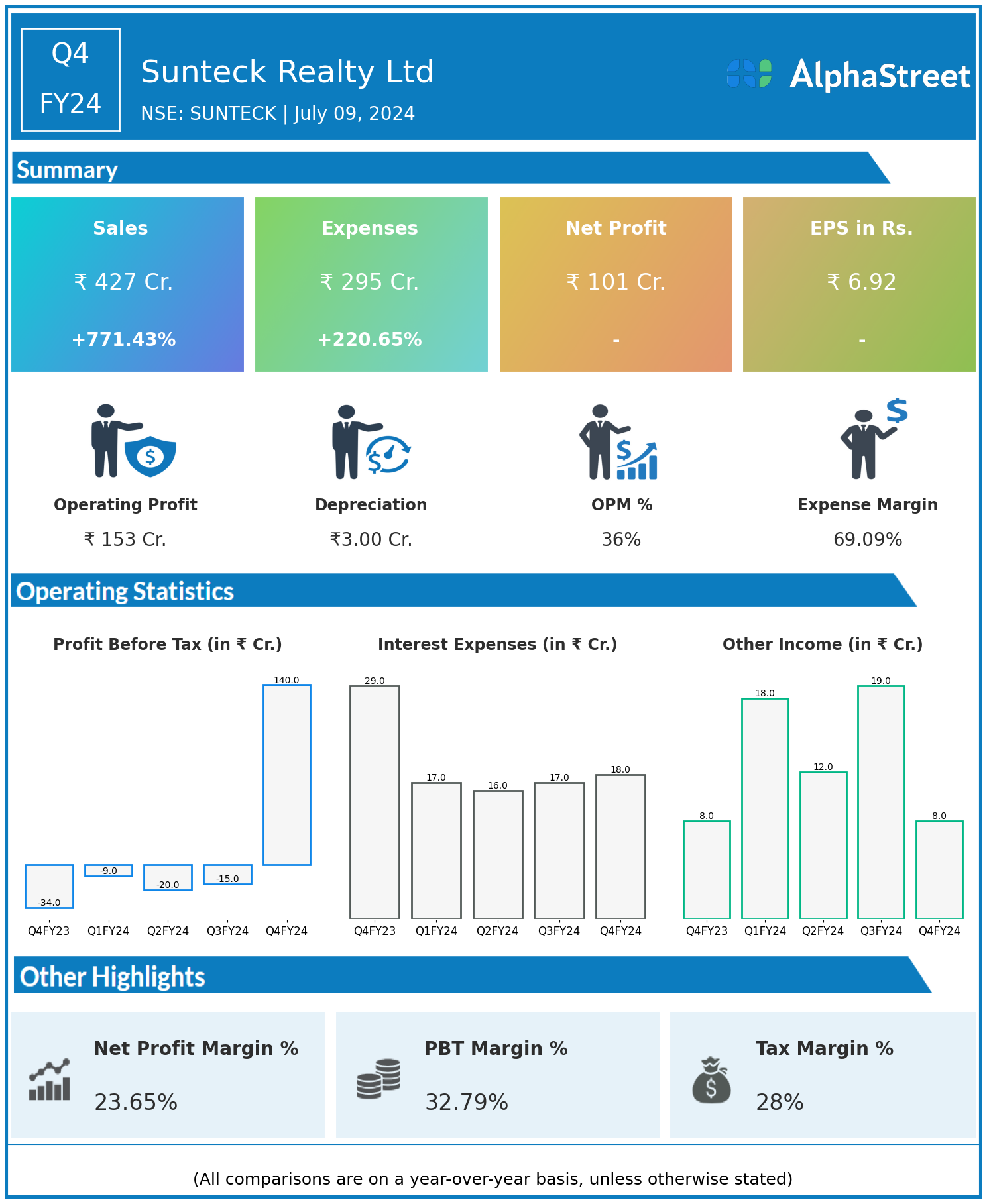 Sunteck Realty Ltd reported Revenues for Q4FY24 of ₹427.00 Crores up from ₹49.00 Crore year on year, a rise of 771.43%.