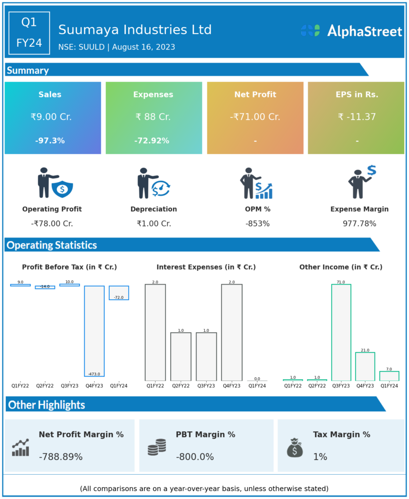 - Suumaya Industries Ltd reported Revenues for Q1FY24 of ₹9.00 Crores down from ₹333.00 Crore year on year, a fall of 97.3%.