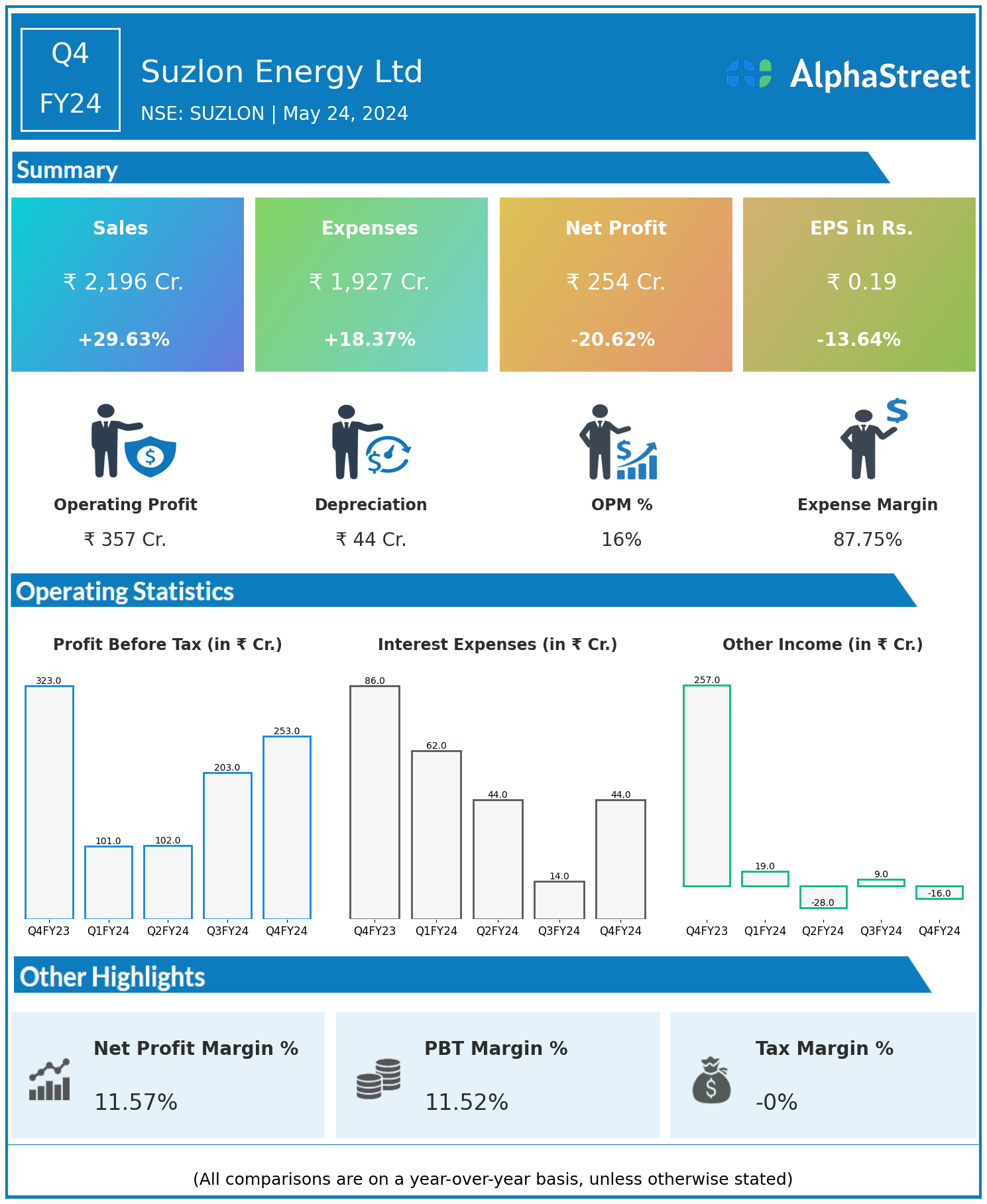 Suzlon Energy Ltd reported Revenues for Q4FY24 of ₹2,196.00 Crores up from ₹1,694.00 Crore year on year, a rise of 29.63%.
