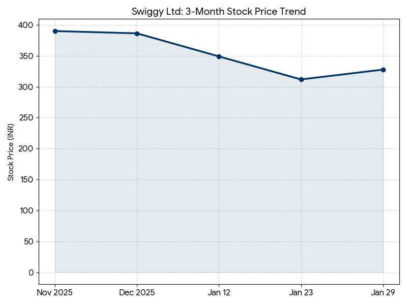 Swiggy Ltd shares closed at INR 324.05, up 0.17%. Q3 FY26 revenue rose 54% to INR 6,148 Crore while net loss widened to INR 1,065 Crore. Food delivery GOV growth reached a three-year high of 20.5%. Market capitalization stands at INR 89,392 Crore.