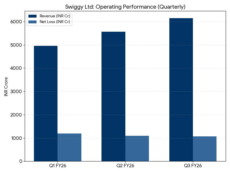 For the third quarter ended December 31, 2025 (Q3 FY26), Swiggy reported consolidated revenue from operations of INR 6,148 Crore. This reflects a 54% increase compared to INR 3,993 Crore in the same period last year. The consolidated net loss for the quarter widened to INR 1,065 Crore, compared to a net loss of INR 799 Crore in Q3 FY25.