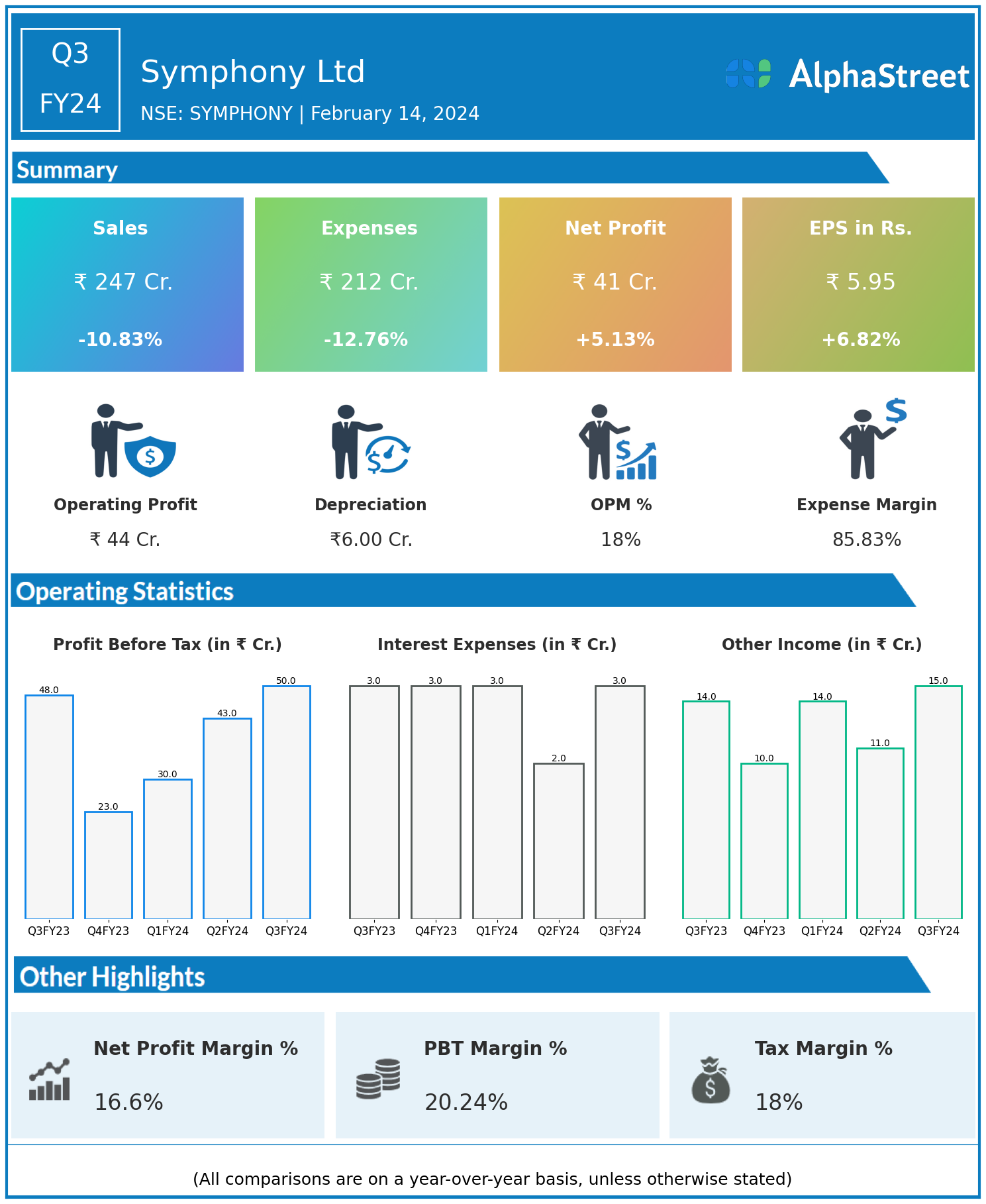Symphony Ltd reported Revenues for Q3FY24 of ₹247.00 Crores down from ₹277.00 Crore year on year, a fall of 10.83%.