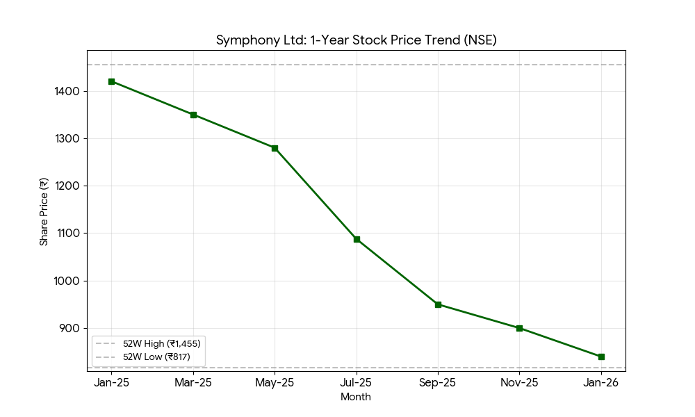 Symphony stock closed 1.45% higher at INR 839.80 today. The company reported a 7.25% decline in quarterly revenue to INR 1.79 billion and an 85.07% drop in net profit. The domestic India segment remains the primary revenue driver, contributing 89% of quarterly sales.