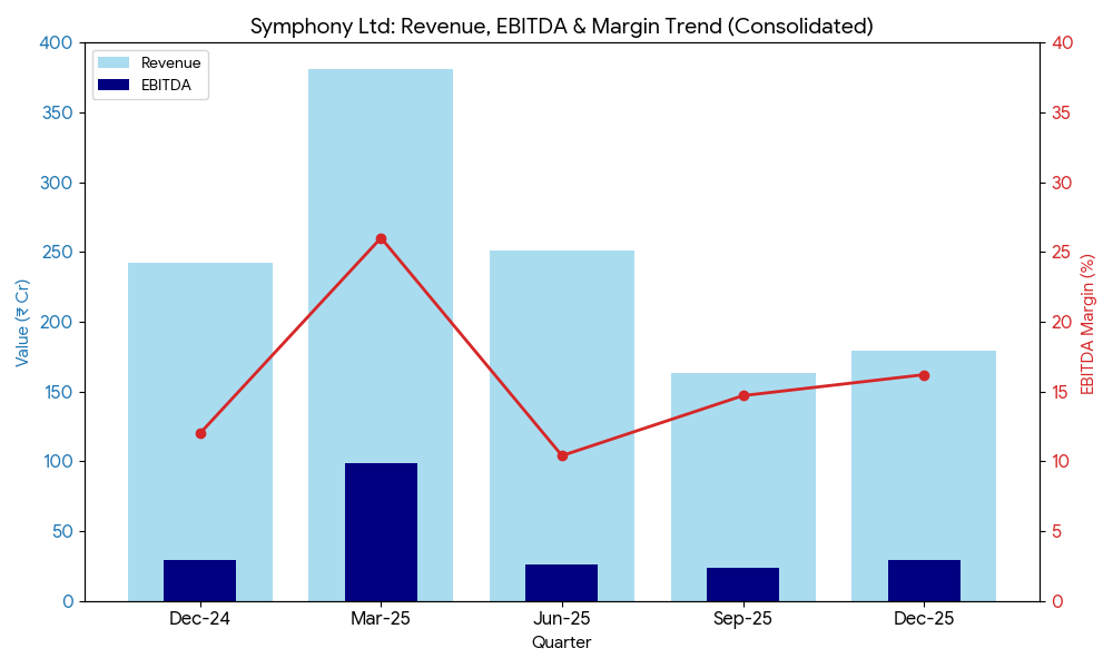 For the third quarter (Q3 FY26), Symphony reported consolidated revenue from operations of INR 1.79 billion, a decline of 7.25% compared to INR 1.93 billion in the corresponding quarter of the previous year.