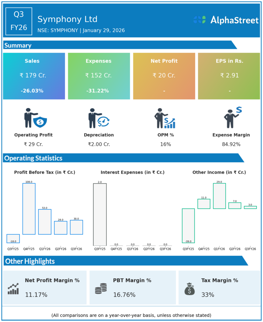 • Revenue from Operations: Consolidated ₹179 cr, −26% YoY vs ₹242 cr, +9.8% QoQ vs ₹163 cr; standalone ₹182 cr (flat YoY), reflecting persistent demand weakness in air coolers amid unseasonal weather, competitive pressures, and market saturation in India (89% of sales).