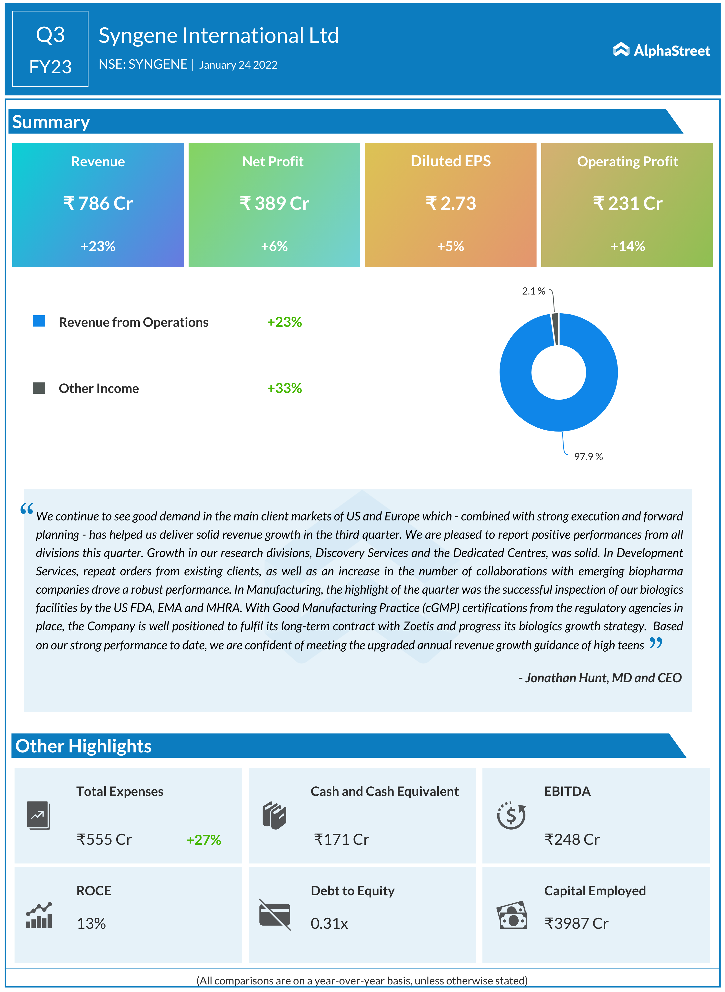 Syngene International reported a 5.5% rise in consolidated net profit to INR 109.70 crore in Q3 FY23 as against INR104 crore posted in Q3 FY22. Revenue from operations jumped 22.5% to INR 785.90 crore in the quarter ended 31 December 2022 as compared to INR 641.40 crore recorded in Q3 FY22.