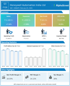 Executive Summary Honeywell Automation India Ltd reported Q3FY26 revenues of ₹1,169 crore, up 7.15% YoY, but consolidated net profit declined...