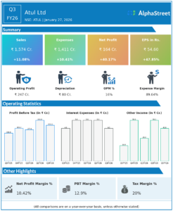 Executive Summary Atul Ltd reported Q3FY26 revenues of ₹1,574 crore, up 11.08% YoY, with consolidated net profit rising 40.17% to...