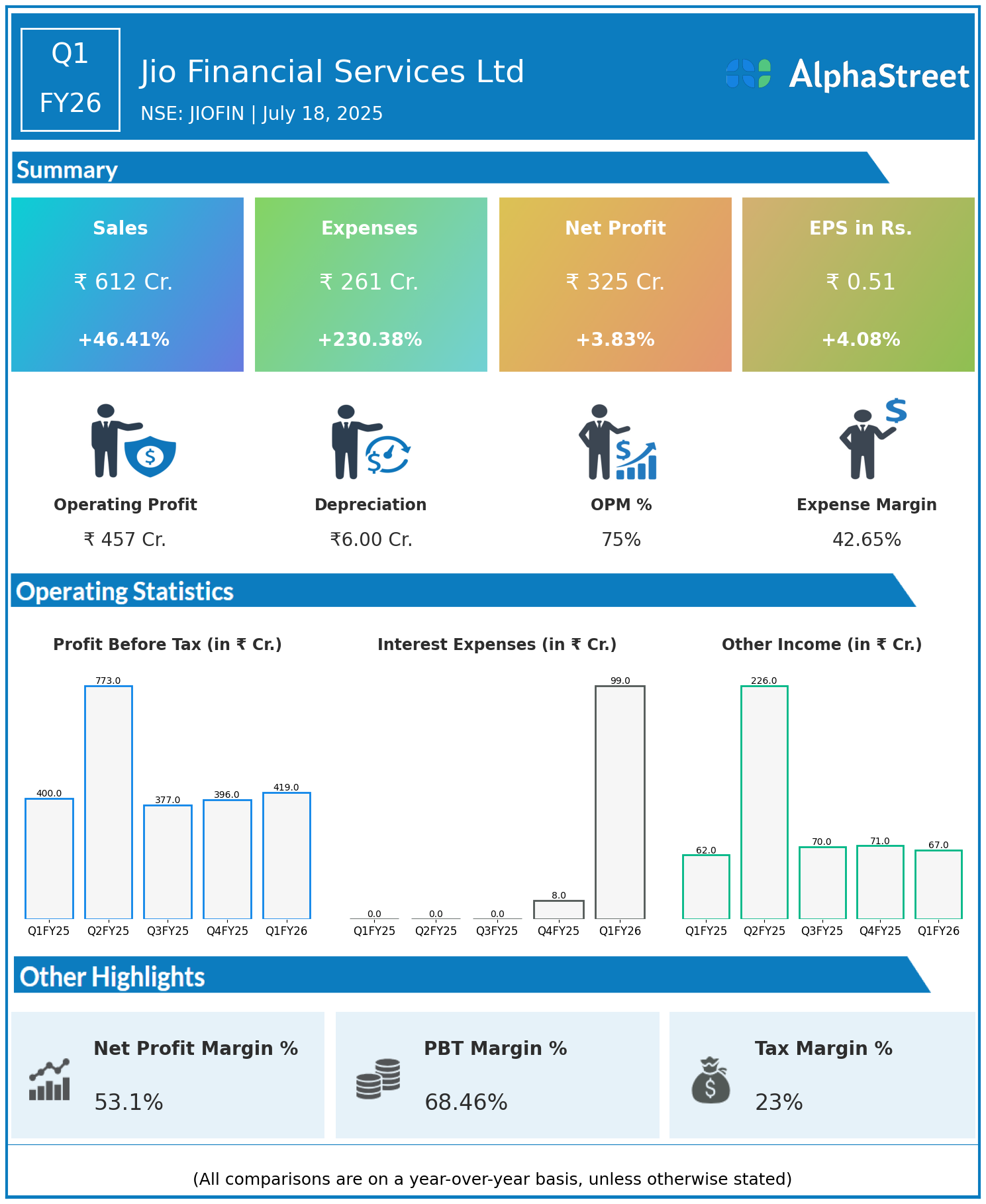 payments bank Jio Financial Services Ltd Q1FY26; 4% rise in Profits 6 months ago JFSL was originally incorporated as Reliance Strategic Investments Private Limited in July, 1999 under the Companies Act 1956. Jio Financial… Jio Financial Services Ltd Q4FY25; 2% rise in Profits 9 months ago JFSL was originally incorporated as Reliance Strategic Investments Private Limited in July, 1999 under the Companies Act 1956. Jio Financial… Jio Financial Services Ltd Q2FY25; 3% rise in Profits 1 year ago JFSL was originally incorporated as Reliance Strategic Investments Private Limited in July, 1999 under the Companies Act 1956. Jio Financial… SBI Cards & Payment Services Ltd Q4FY24; 11% rise in Profits 2 years ago SBI Cards and Payment Services Limited is a non-deposit accepting systemically important nonbanking financial company registered with the RBI. The…