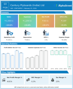 Executive Summary Century Plyboards India Ltd reported Q3FY26 revenues of ₹1,350 crore, up 18.42% YoY, with consolidated net profit increasing...