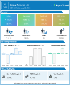 Executive Summary Gopal Snacks Ltd reported Q3FY26 revenues of ₹401 crore, up 1.78% YoY, with consolidated net profit surging 200.0%...