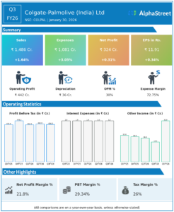 Executive Summary Colgate-Palmolive (India) Ltd reported Q3FY26 revenues of ₹1,486 crore, up 1.64% YoY, with consolidated net profit stable at...