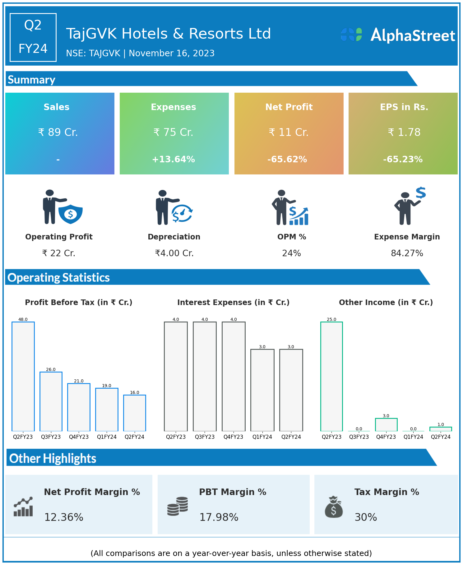 Total Expenses for Q2FY24 of ₹75.00 Crores up from ₹66.00 Crores year on year, a rise of 13.64%.