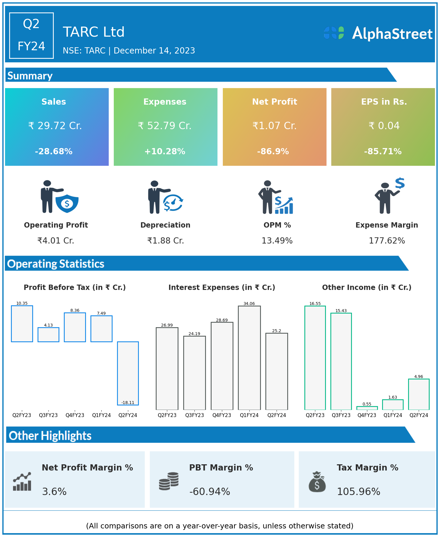 TARC Ltd reported Revenues for Q2FY24 of ₹29.72 Crores down from ₹41.67 Crore year on year, a fall of 28.68%.