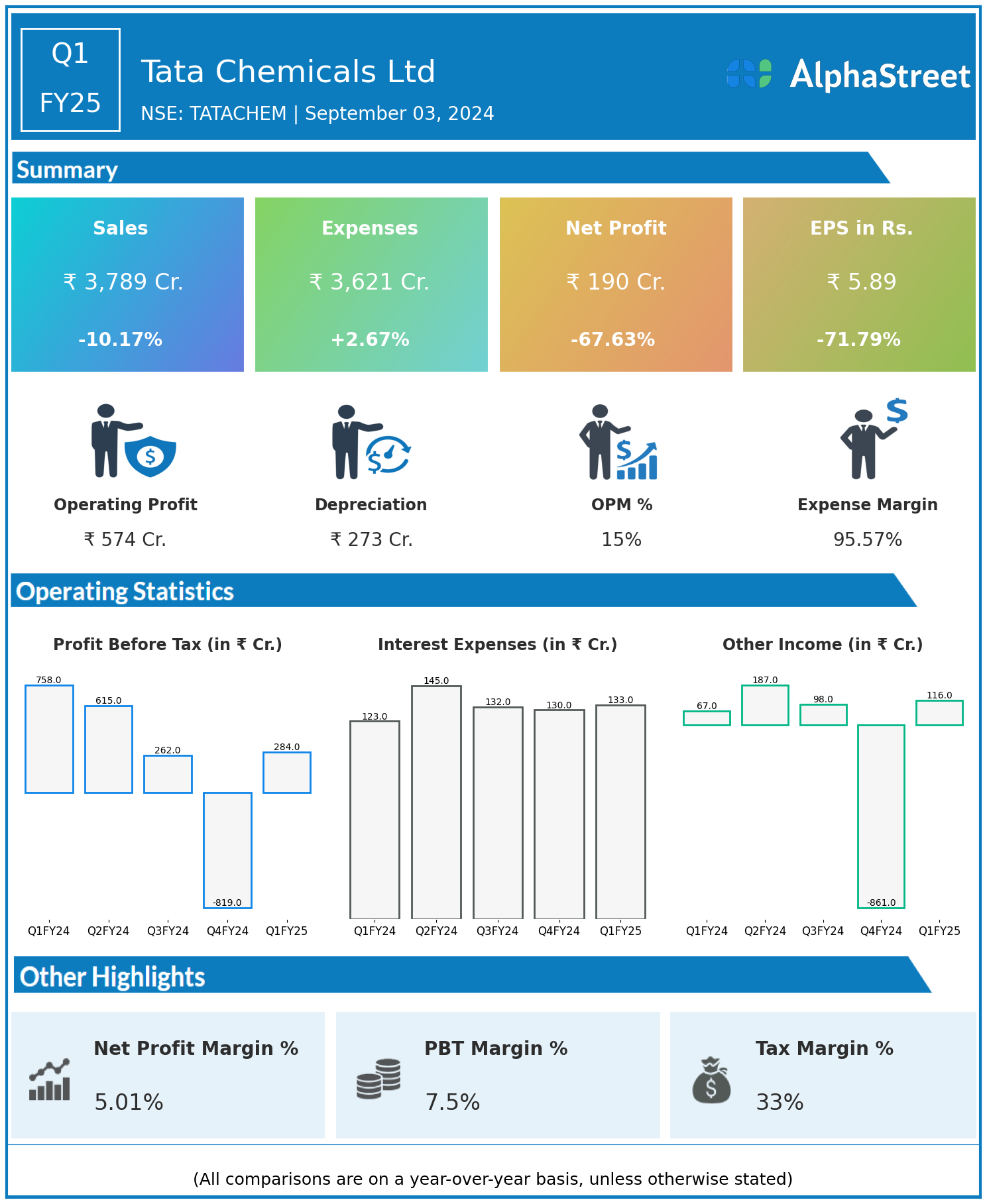 Tata Chemicals Ltd reported Revenues for Q1FY25 of ₹3,789.00 Crores down from ₹4,218.00 Crore year on year, a fall of 10.17%.