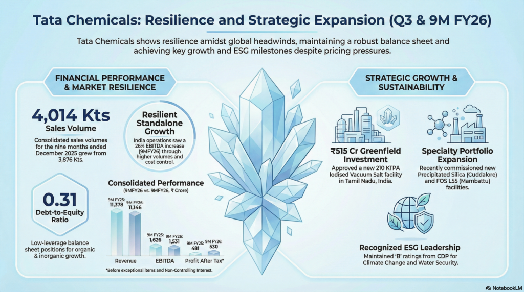 Tata Chemicals’ standalone operations showed more resilience, with Q3 revenue rising 3% to ₹1,204 crore and EBITDA increasing 9% to ₹228 crore, supported by higher volumes and disciplined cost management.