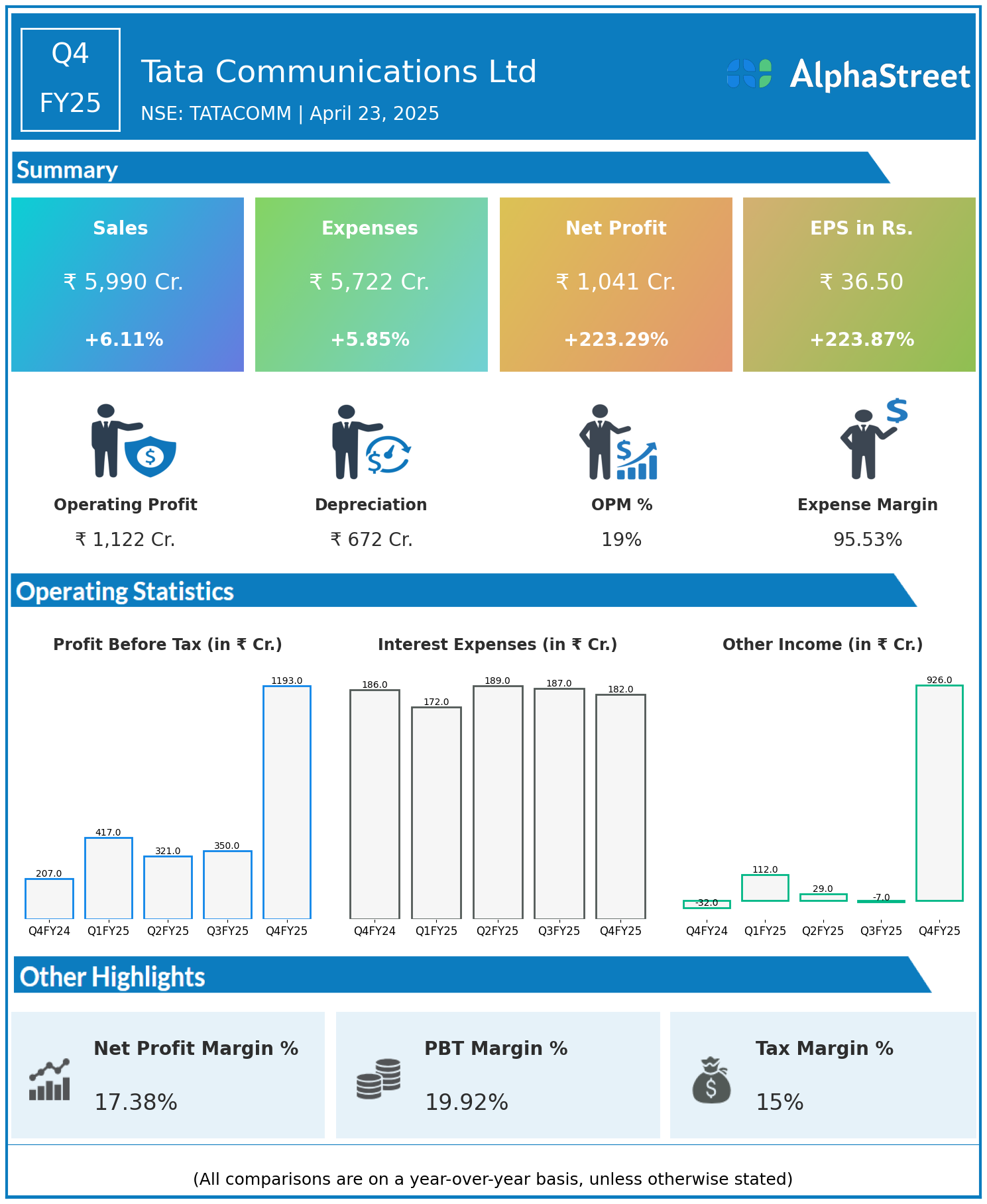 Tata Communications Ltd reported Revenues for Q4FY25 of ₹5,990.00 Crores up from ₹5,645.00 Crore year on year, a rise of 6.11%.