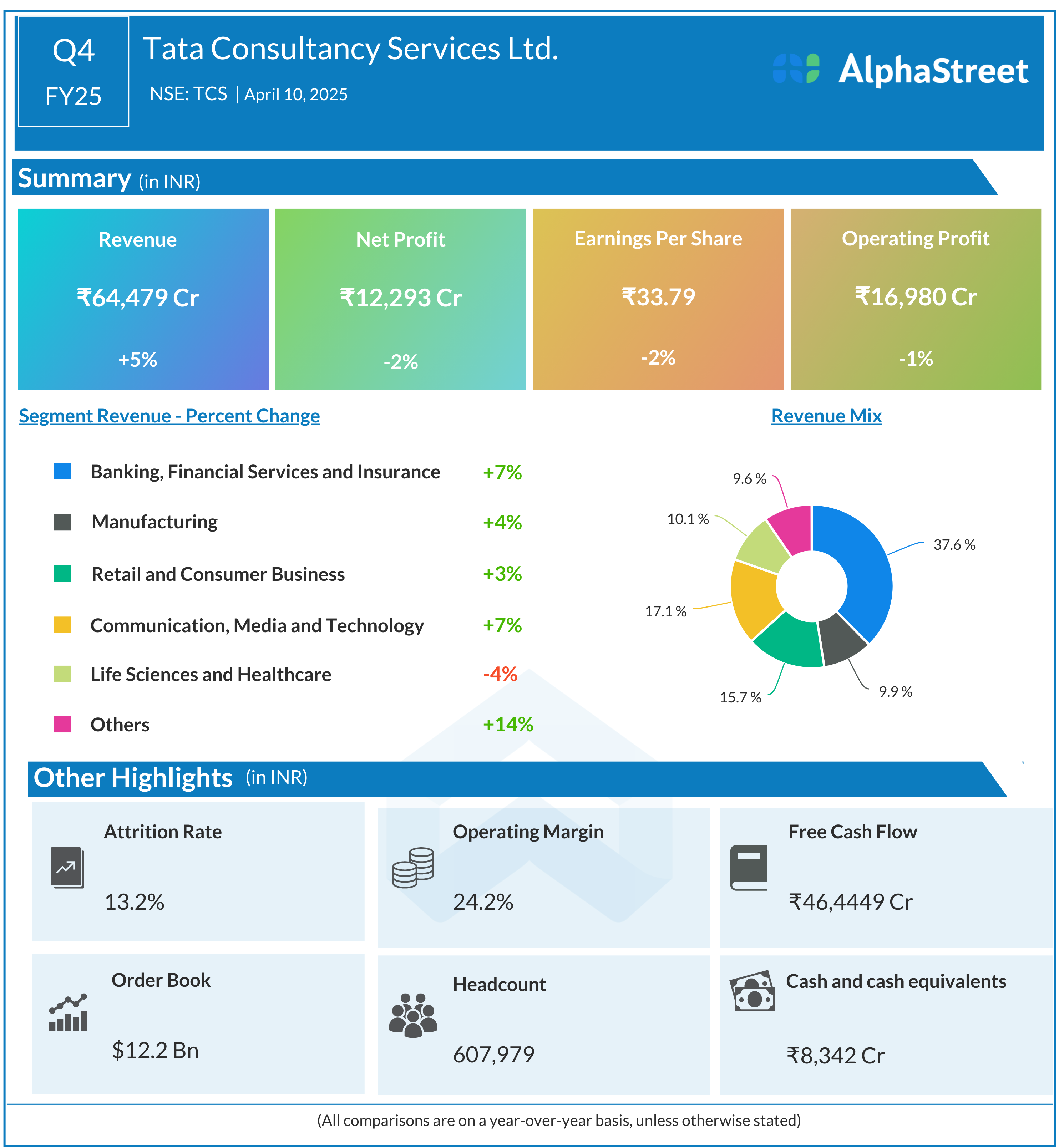 Tata Consultancy Services Ltd reported Revenues for Q4FY25 of ₹64,479.00 Crores up from ₹61,237.00 Crore year on year, a rise of 5.29%.