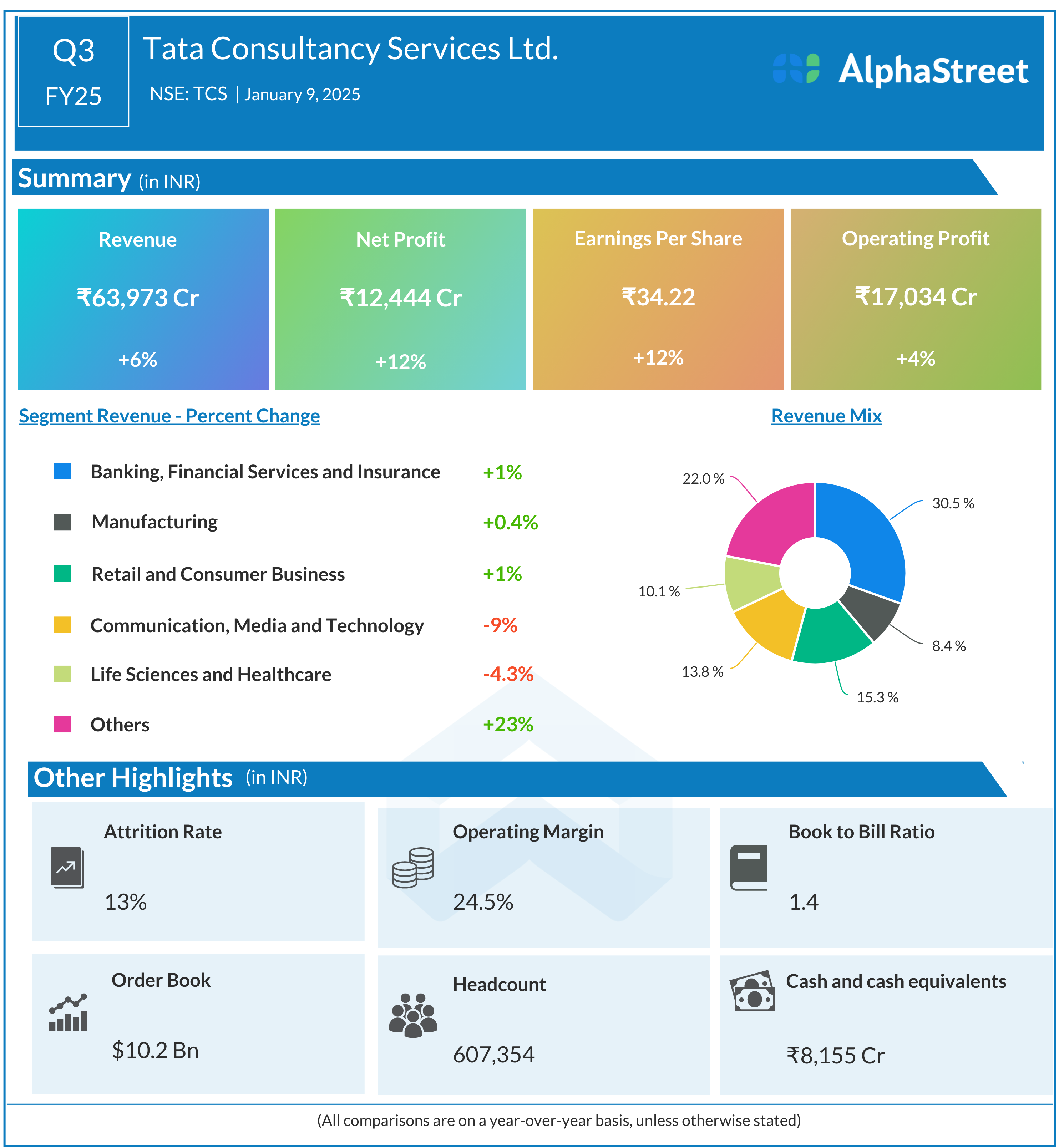 Tata Consultancy Services Ltd reported Revenues for Q3FY25 of ₹63,973.00 Crores up from ₹60,583.00 Crore year on year, a rise of 5.6%.