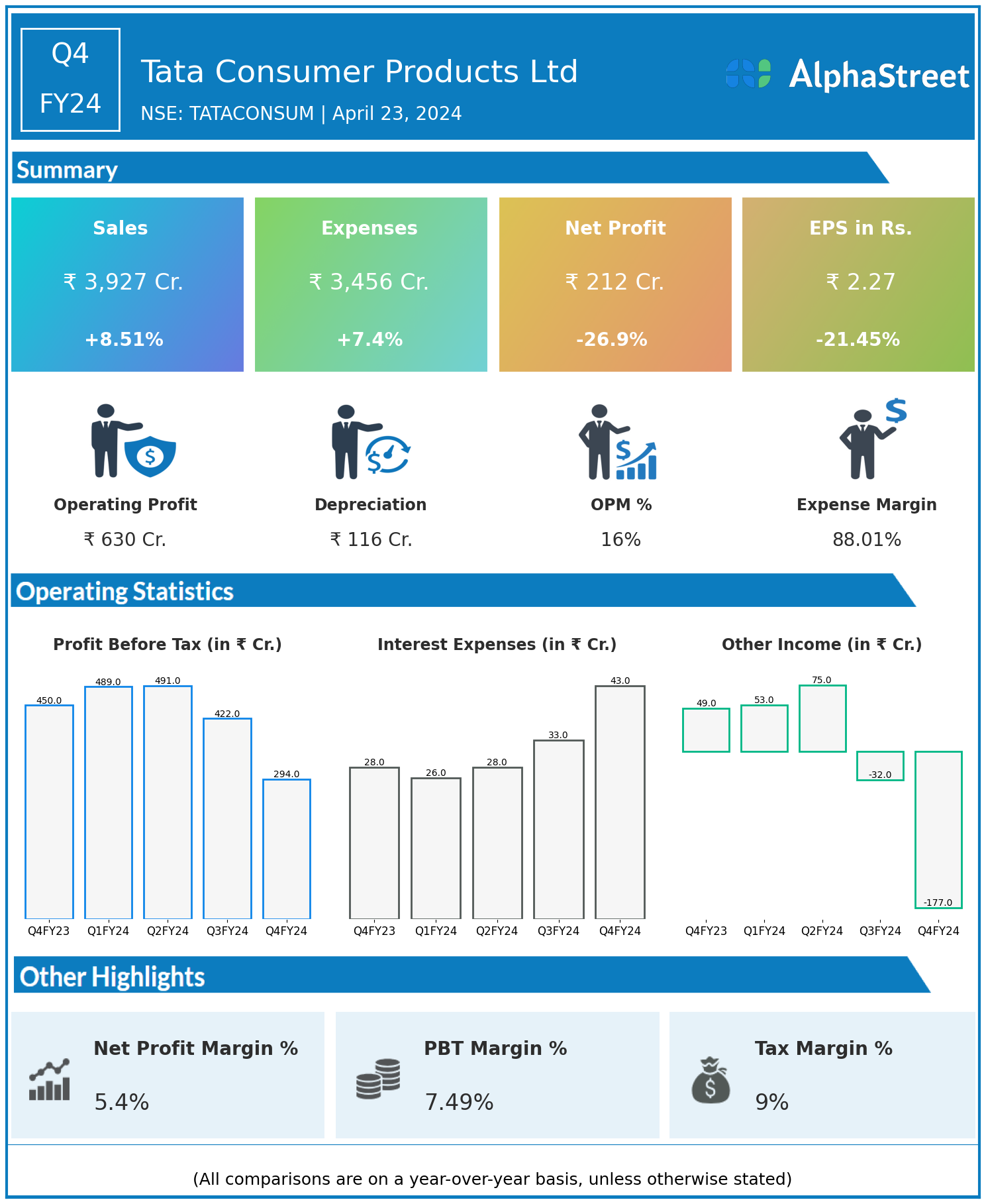 Tata Consumer Products Ltd reported Revenues for Q4FY24 of ₹3,927.00 Crores up from ₹3,619.00 Crore year on year, a rise of 8.51%.