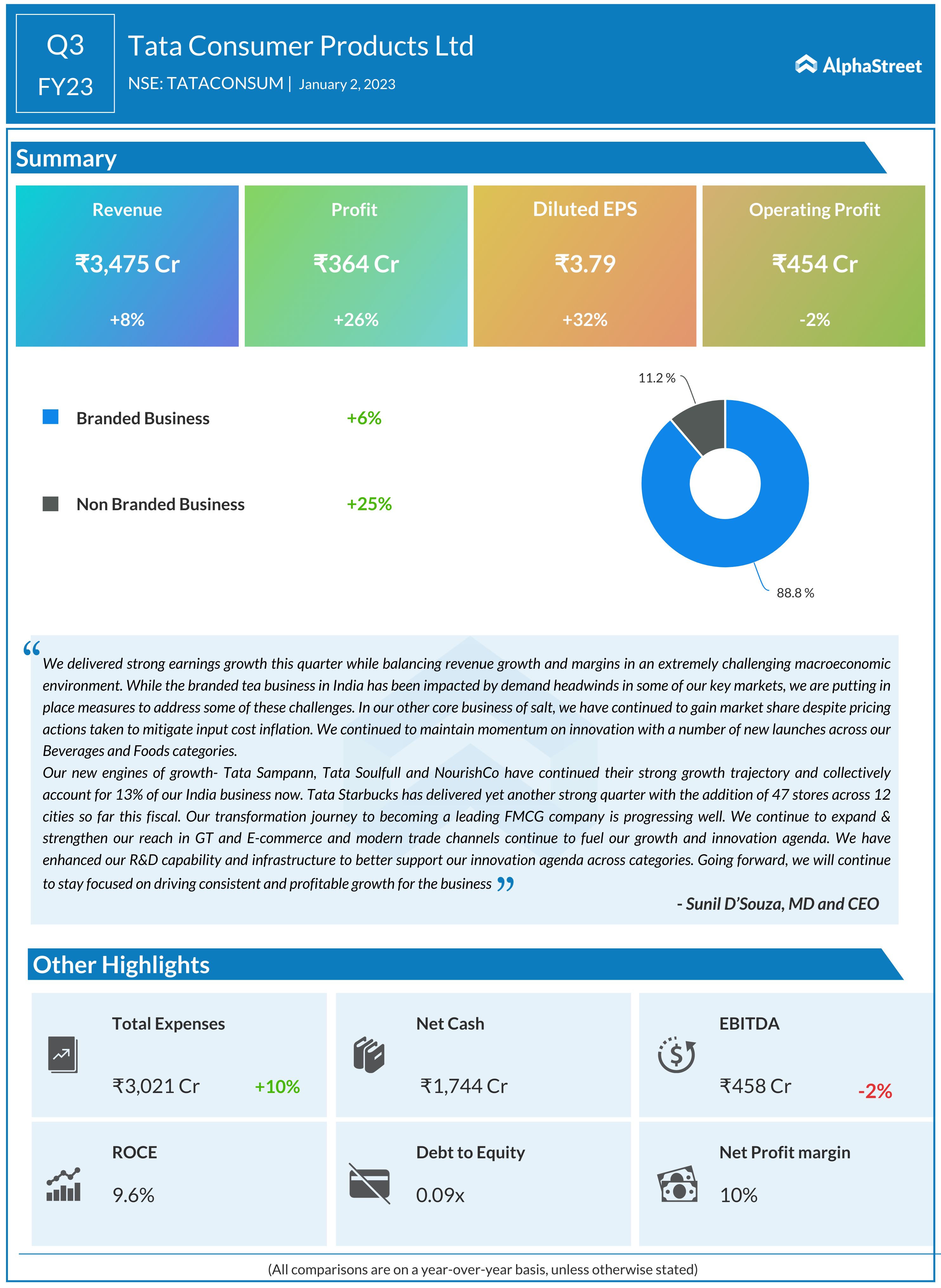 In the December quarter, revenue from the Indian market rose 7.72 per cent to INR 2,165.34 crore as against INR 2,010.04 crore in the year-ago period. TCPL has continued momentum on innovation with a number of new launches across its beverages and foods categories. TCPL Managing Director and CEO Sunil D’Souza said: “We delivered strong earnings growth this quarter while balancing revenue growth and margins in an extremely challenging macroeconomic environment.”