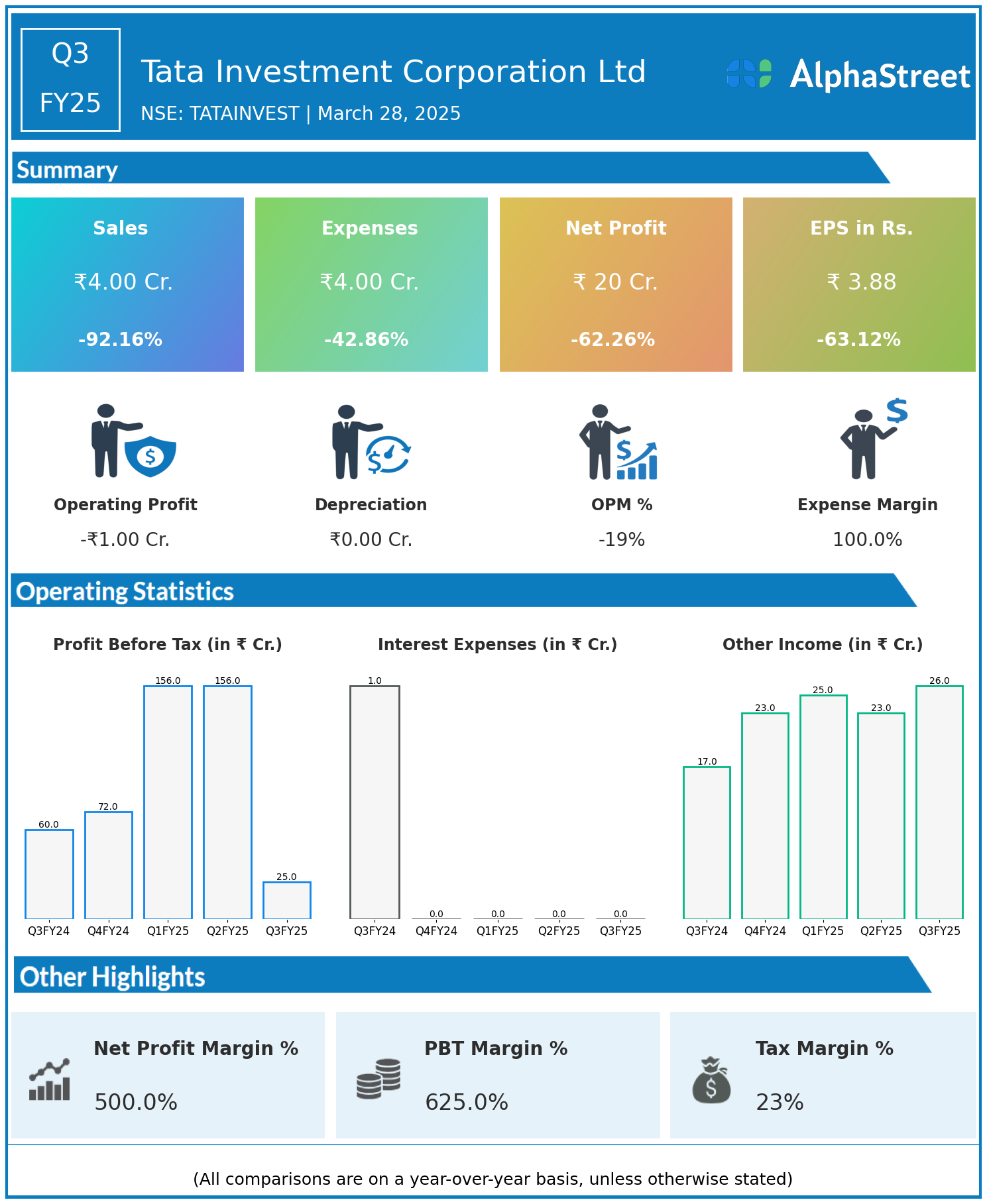 Tata Investment Corporation Ltd reported Revenues for Q3FY25 of ₹4.00 Crores down from ₹51.00 Crore year on year, a fall of 92.16%.